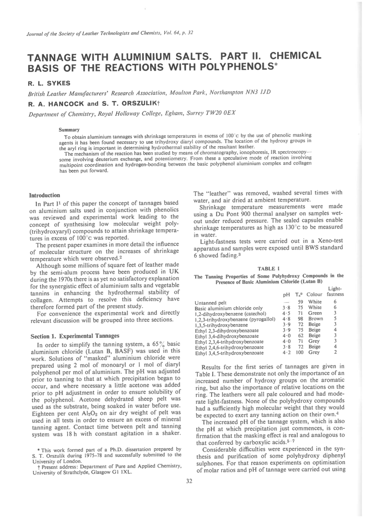 To obtain aluminium tannages with shrinkage temperatures in excess of 100°C by the use of phenolic masking agents it has been found necessary to use trihydroxy diaryl compounds. The location of the hydroxy groups in the aryl ring is important in determining hydrothermal stability of the resultant leather. The mechanism of the reaction has been studied by means of chromatography, ionophoresis, JR spectroscopy – some involving deuterium exchange, and potentiometry. From these a speculative mode of reaction involving multipoint coordination and hydrogen-bonding between the basic polyphenol aluminium complex and collagen has been put forward.