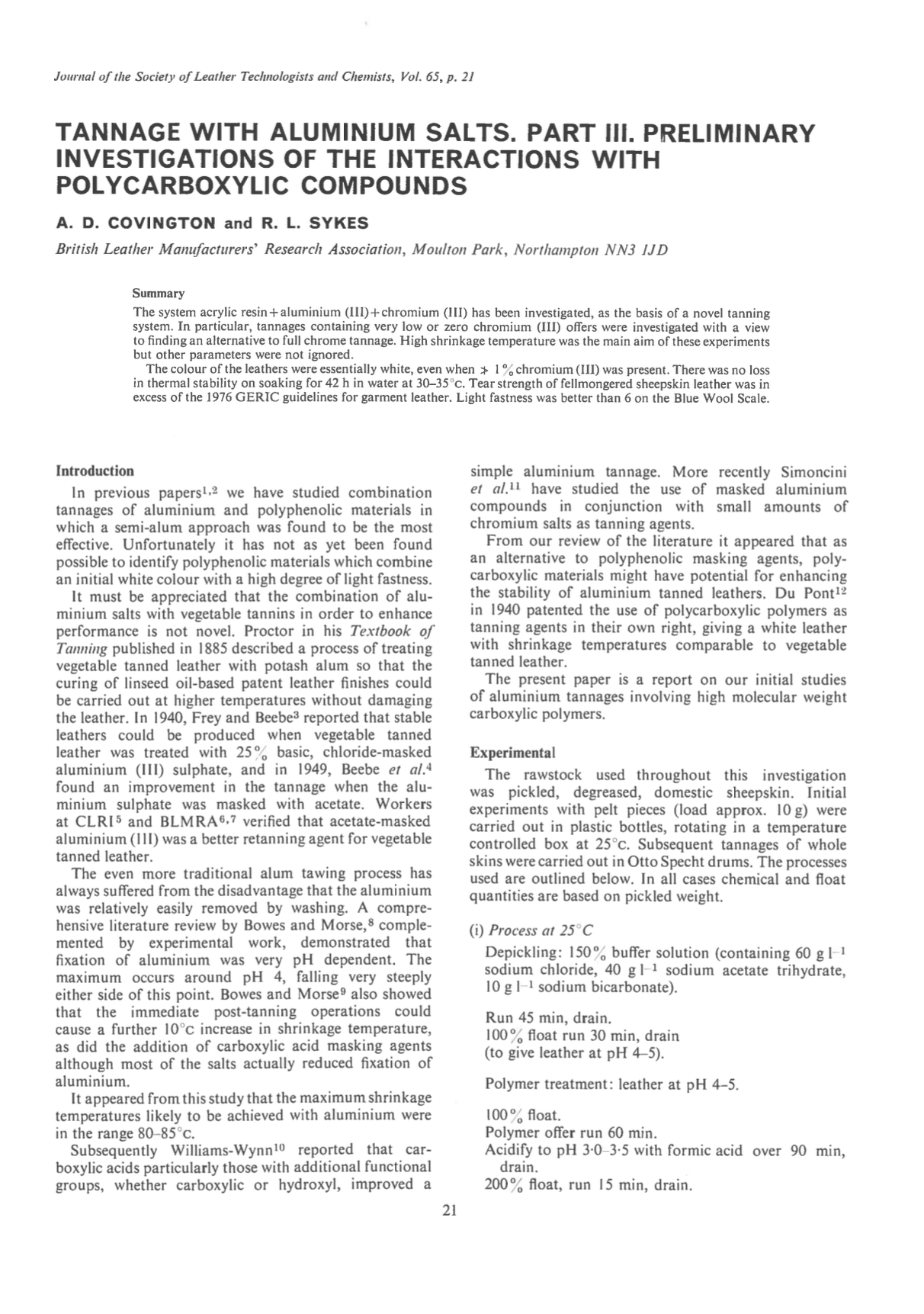 The system acrylic resin+ aluminium (III)+ chromium (Ill) has been investigated, as the basis of a novel tanning system. In particular, tannages containing very low or zero chromium (III) offers were investigated with a view to finding an alternative to full chrome tannage. High shrinkage temperature was the main aim of these experiments but other parameters were not ignored. The colour of the leathers were essentially white, even when > 1% chromium (III) was present. There was no loss in thermal stability on soaking for 42 h in water at 30-35°C. Tear strength of fellmongered sheepskin leather was in excess of the 1976 GERIC guidelines for garment leather. Tight fastness was better than 6 on the Blue Wool Scale.