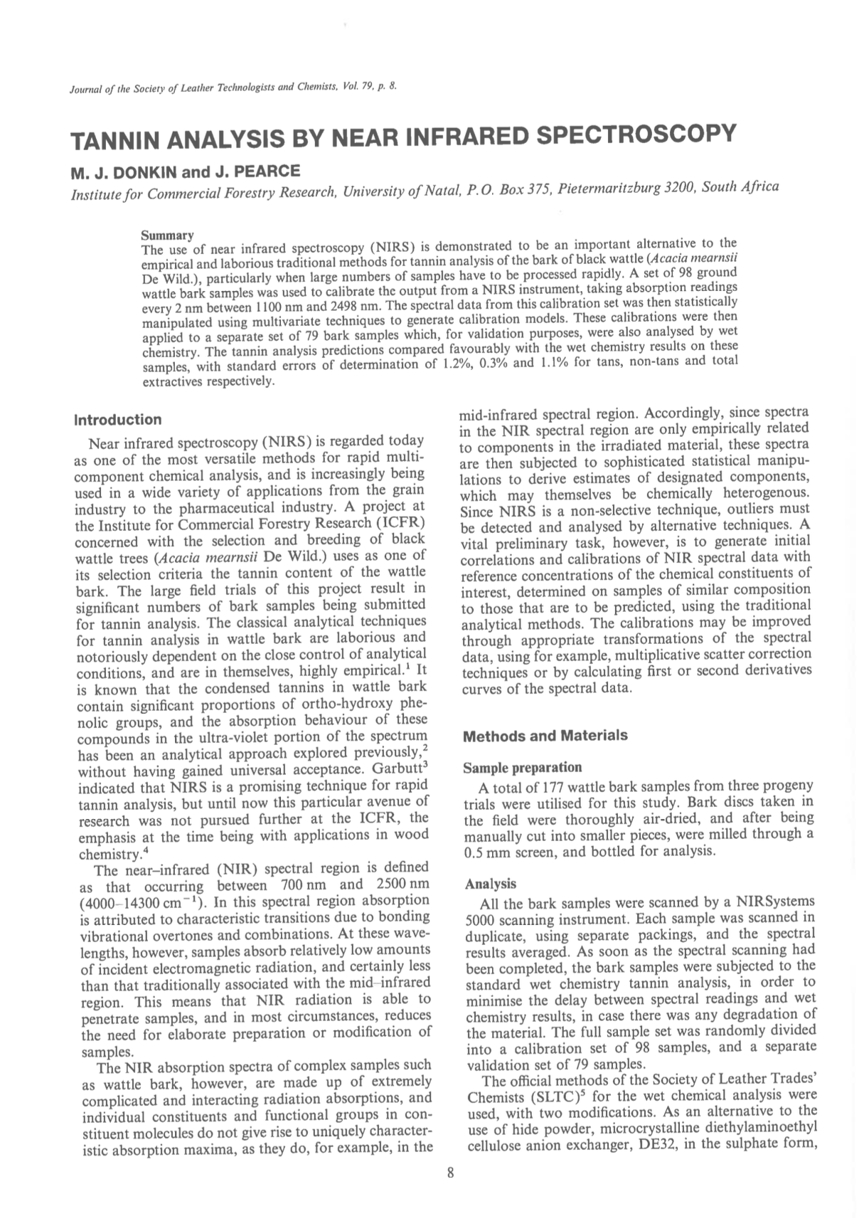 The use of near infrared spectroscopy (NIRS) is demonstrated to be an important alternative to the empirical and laborious traditional methods for tannin analysis of the bark of black wattle (Acacia mearnsii De Wild.), particularly when large numbers of samples have to be processed rapidly. A set of 98 ground wattle bark samples was used to calibrate the output from a NIRS instrument, taking absorption readings every 2 nm between 1100 nm and 2498 nm. The spectral data from this calibration set was then statistically manipulated using multivariate techniques to generate calibration models. These calibrations were then applied to a separate set of 79 bark samples which, for validation purposes, were also analysed by wet chemistry. The tannin analysis predictions compared favourably with the wet chemistry results on these samples, with standard errors of determination of 1.2%, 0.3% and 1.1% for tans, non-tans and total extractives respectively.