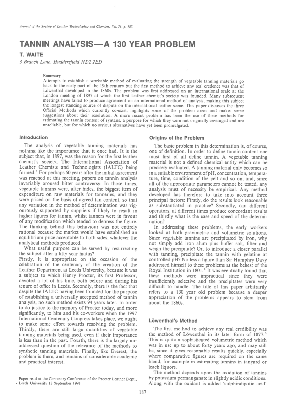 Attempts to establish a workable method of evaluating the strength of vegetable tanning materials go back to the early part of the 19th century but the first method to achieve any real credence was that of Löwenthal developed in the 1860s. The problem was first addressed on an international scale at the London meeting of 1897 at which the first leather chemist’s society was founded. Many subsequent meetings have failed to produce agreement on an international method of analysis, making this subject the longest standing source of dispute on the international leather scene. This paper discusses the three Official Methods which currently co-exist, highlights some of the problem areas and makes some suggestions about their resolution. A more recent problem has been the use of these methods for estimating the tannin content of syntans, a purpose for which they were not originally envisaged and are unreliable, but for which no serious alternatives have yet been promulgated.