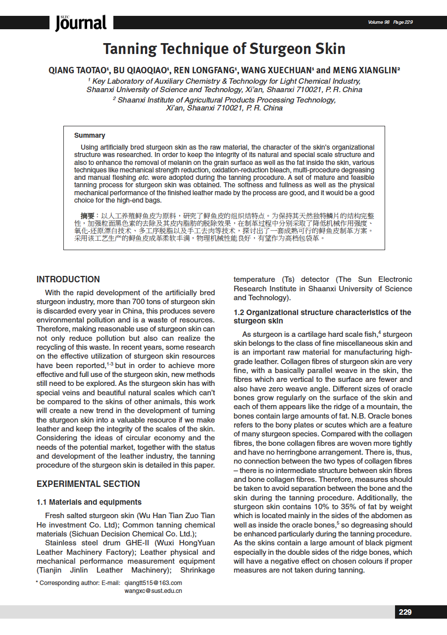 Using artificially bred sturgeon skin as the raw material, the character of the skin’s organizational structure was researched. In order to keep the integrity of its natural and special scale structure and also to enhance the removal of melanin on the grain surface as well as the fat inside the skin, various techniques like mechanical strength reduction, oxidation-reduction bleach, multi-procedure degreasing and manual fleshing etc. were adopted during the tanning procedure. A set of mature and feasible tanning process for sturgeon skin was obtained. The softness and fullness as well as the physical mechanical performance of the finished leather made by the process are good, and it would be a good choice for the high-end bags.