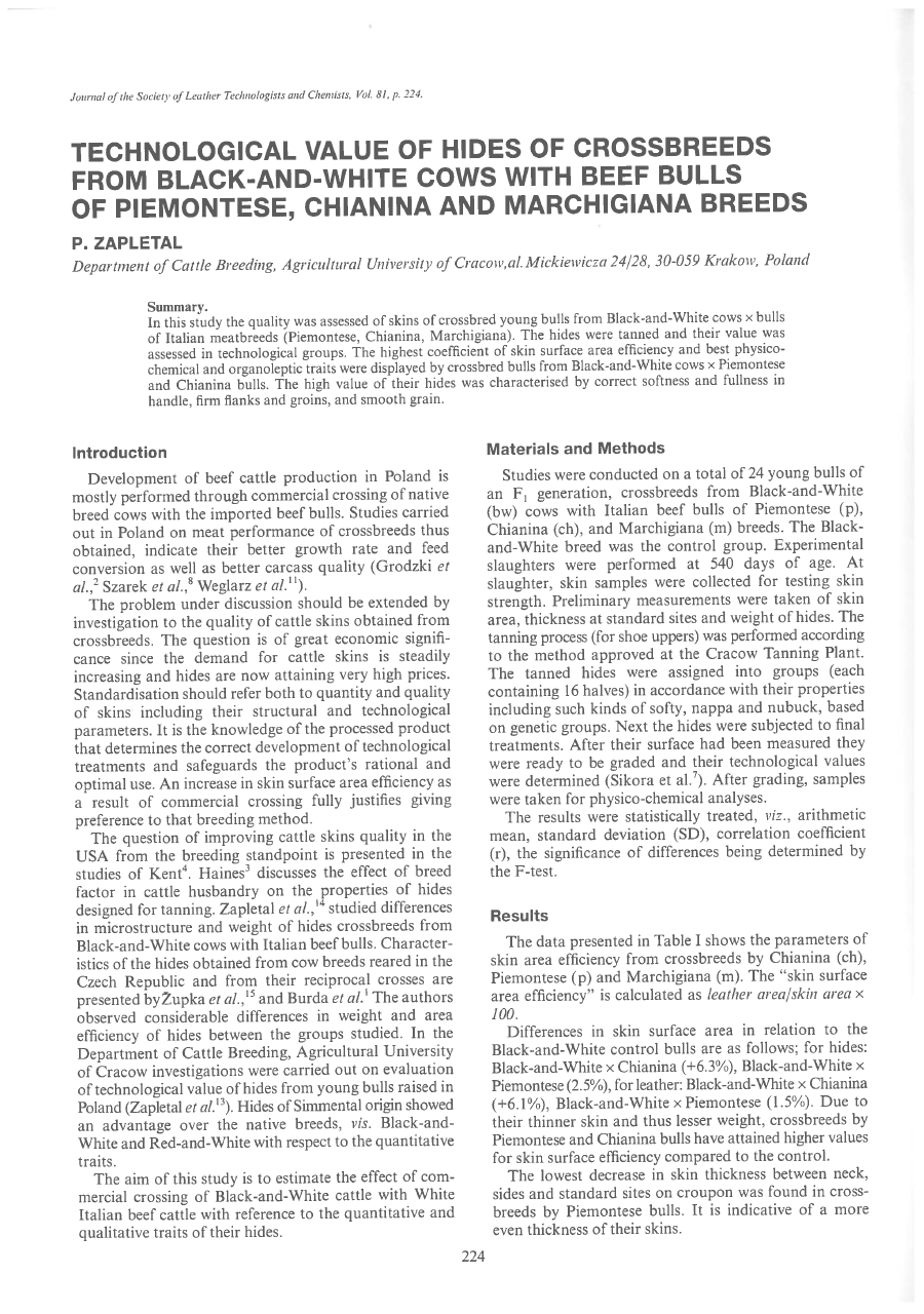 In this study the quality was assessed of skins of crossbred young bulls from Black-and-White cows x bulls of Italian meatbreeds (Piemontese, Chianina, Marchigiana). The hides were tanned and their value was assessed in technological groups. The highest coefficient of skin surface area efficiency and best physico chemical and organoleptic traits were displayed by crossbred bulls from Black-and-White cows x Piemontese and Chianina bulls. The high value of their hides was characterised by correct softness and fullness in handle, firm flanks and groins, and smooth grain.
