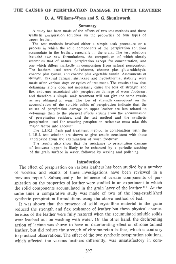 The test methods involved either a simple soak procedure or a process in which the solid components of the perspiration solutions accumulate in the leather, especially in the grain. The test solutions included two new formulations, the composition of which closely resembles that of natural perspiration except for concentration, and one which differs markedly in composition from natural perspiration. The leathers used were full-chrome, chrome plus glutaraldehyde, chrome plus syntan, and chrome plus vegetable tannin. Assessments of strength, flexural fatigue, shrinkage and hydrothermal stability were made after various days or cycles of treatment. The results show that detannage alone does not necessarily cause the loss of strength and flex endurnce associated with perspiration damage of worn footwear, and therefore a simple soak treatment will not give the same results as are obtained in wear. The loss of strength consequent on the accumulation of the soluble solids of perspiration indicate that the causes of perspiration damage to upper leather are less related to detannage than to the physical effects arising from the accumulation of perspiration residues, and the test method and the synthetic perspiration used for assessing perspiration resistance must take this major factor into account.