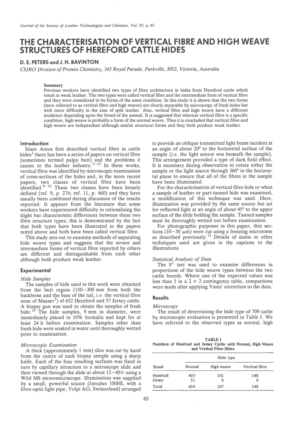Previous workers have identified two types of fibre architecture in hides from Hereford cattle which result in weak leather. The two types were called vertical fibre and the intermediate form of vertical fibre and they were considered to be forms of the same condition. In this study it is shown that the two forms (here referred to as vertical fibre and high weave) are clearly separable by microscopy of fresh hides but with more difficulty in the case of split leather. Also, vertical fibre and high weave have a different incidence depending upon the breed of the animal. It is suggested that whereas vertical fibre is a specific condition, high weave is probably a form of the normal weave. Thus it is concluded that vertical fibre and high weave are independent although similar structural forms and they both produce weak leather.