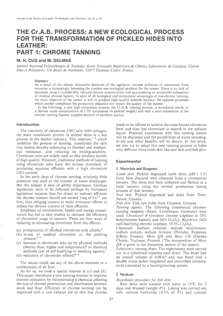 As a result of the almost impossible demands of the legislator, chrome pollution of wastewater from tanneries is increasingly becoming the number one ecological problem for the tanner. There is no lack of processes using a considerably reduced chrome concentration and guaranteeing an acceptable exhaustion of residual chrome liquors. In spite of all ecological and economical advantages of low-chrome tanning, the main objective of the tanner is still to produce high quality saleable leathers. He requires processes which neither complicate the production sequence nor impair the quality of the leather. In the following, a new high exhaustion process, the CrAB. tanning process, is introduced which, at a chrome oxide concentration of 1.3% (calculated on pickled weight) and with a total exhaustion of the chrome tanning liquors, supplies leathers of excellent quality.