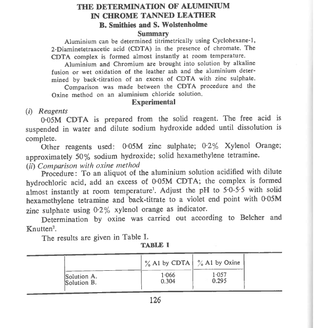 Aluminium can be determined titrimetrically using Cyclohexane-1, 2-Diaminetetraacetic acid (CDTA) in the presence of chromate. The CDTA complex is formed almost instantly at room temperature. Aluminium and Chromium are brought into solution by alkaline fusion or wet oxidation of the leather ash and the aluminium deter mined by back-titration of an excess of CDTA with zinc sulphate. Comparison was made between the CDTA procedure and the Oxine method on an aluminium chloride solution.