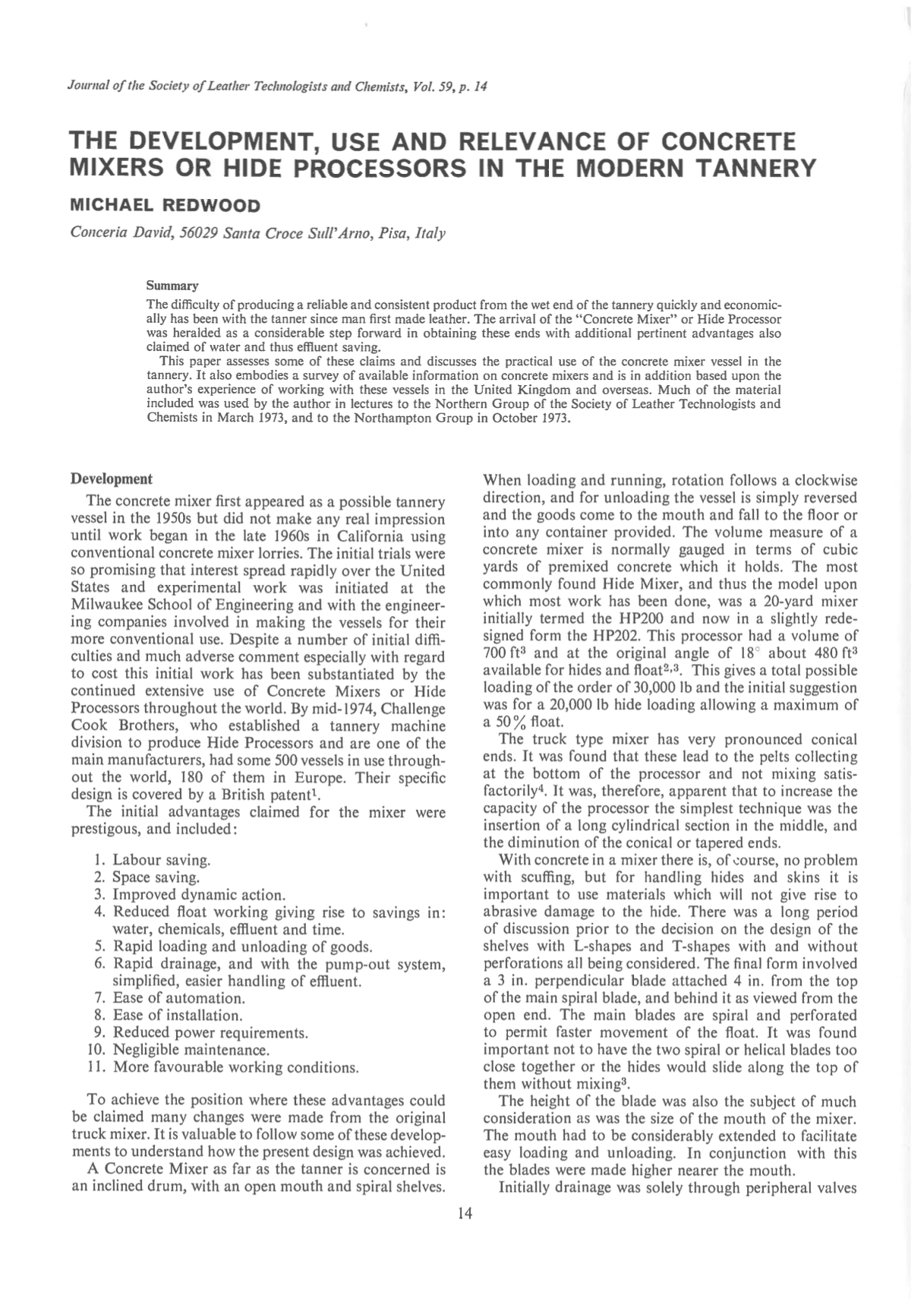 The difficulty of producing a reliable and consistent product from the wet end of the tannery quickly and economically has been with the tanner since man first made leather. The arrival of the “Concrete Mixer” or Hide Processor was heralded as a considerable step forward in obtaining these ends with additional pertinent advantages also claimed of water and thus effluent saving. This paper assesses some of these claims and discusses the practical use of the concrete mixer vessel in the tannery. It also embodies a survey of available information on concrete mixers and is in addition based upon the author’s experience of working with these vessels in the United Kingdom and overseas. Much of the material included was used by the author in lectures to the Northern Group of the Society of Leather Technologists and Chemists in March 1973, and to the Northampton Group in October 1973.