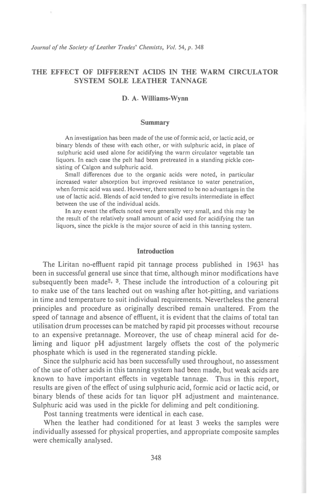 An investigation has been made of the use of formic acid, or lactic acid, or binary blends of these with each other, or with sulphuric acid, in place of sulphuric acid used alone for acidifying the warm circulator vegetable tan liquors. In each case the pelt had been pretreated in a standing pickle consisting of Calgon and sulphuric acid. Small differences due to the organic acids were noted, in particular increased water absorption but improved resistance to water penetration, when formic acid was used. However, there seemed to be no advantages in the use of lactic acid. Blends of acid tended to give results intermediate in effect between the use of the individual acids. In any event the effects noted were generally very small, and this may be the result of the relatively small amount of acid used for acidifying the tan liquors, since the pickle is the major source of acid in this tanning system.