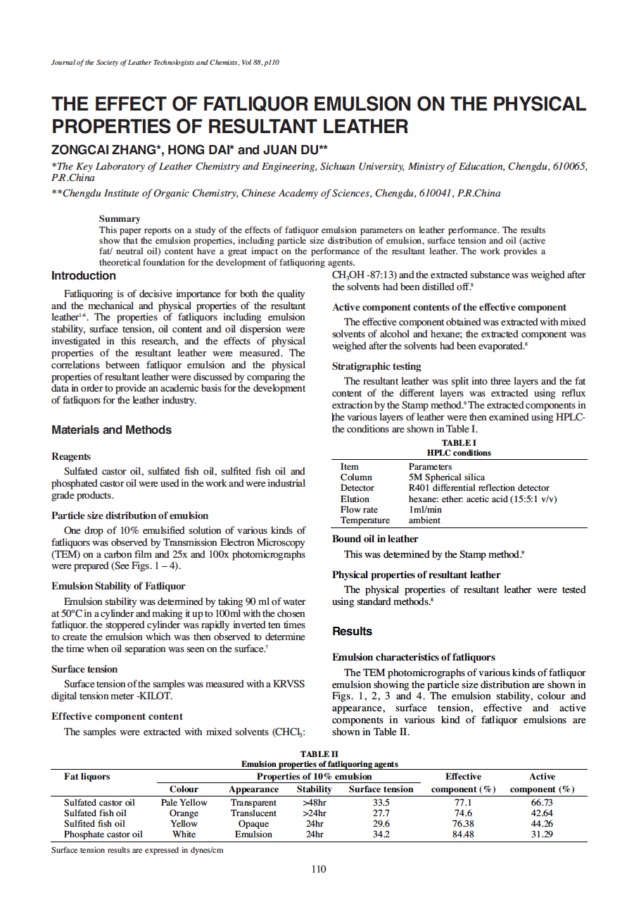 This paper reports on a study of the effects of fatliquor emulsion parameters on leather performance. The results show that the emulsion properties, including particle size distribution of emulsion, surface tension and oil (active fat/ neutral oil) content have a great impact on the performance of the resultant leather. The work provides a theoretical foundation for the development of fatliquoring agents.