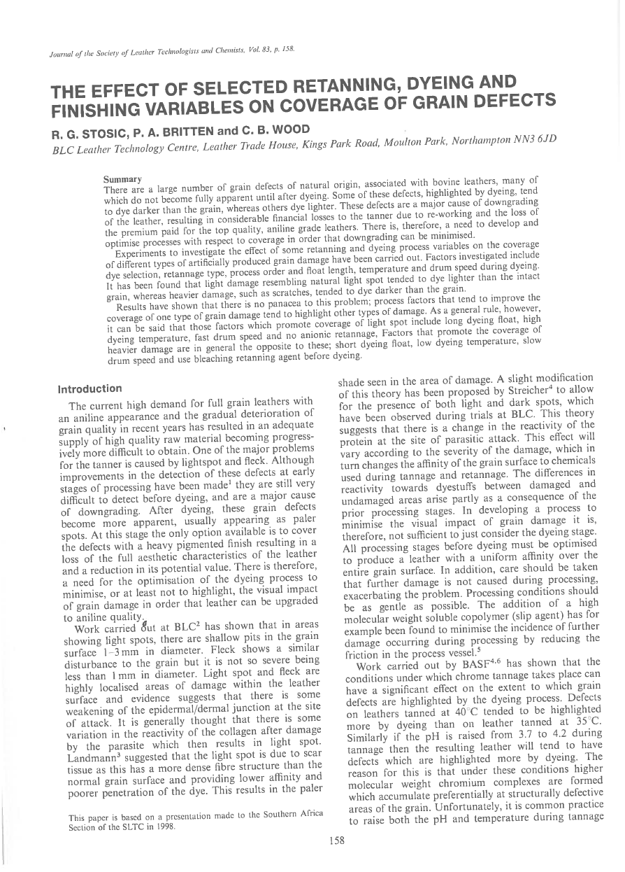 Results have shown that there is no panacea to this problem; process factors that tend to improve the coverage of one type of grain damage tend to highlight other types of damage. As a general rule, however. it can be said that those factors which promote coverage of light spot include long dyeing float, high dyeing temperature, fast drum speed and no anionic retannage, Factors that promote the coverage of heavier damage are in general the opposite to these; short dyeing float, low dyeing temperature, slow drum speed and use bleaching retanning agent before dyeing.