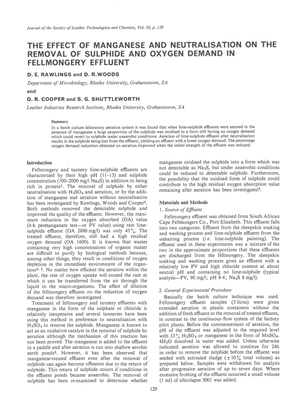 In a batch culture laboratory aeration system it was found that when lime sulphide effluents were aerated in the presence of manganese a large proportion of the sulphide was oxidised to a form still having an oxygen demand which could revert to sulphide under anaerobic conditions. Aeration of lime-sulphide effluent after neutralisation results in the sulphide being lost from the effluent, yielding an effluent with a lower oxygen demand. The percentage oxygen demand reduction obtained on aeration improved when the initial strength of the effluent was reduced.