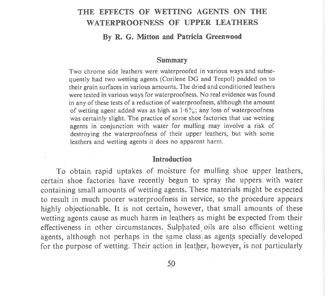 Two chrome side leathers were waterproofed in various ways and subse quently had two wetting agents (Corilene DG and Teepol) padded on to their grain surfaces in various amounts. The dried and conditioned leathers were tested in various ways for waterproofness. No real evidence was found in any of these tests of a reduction of waterproofness, although the amount of wetting agent added was as high as 16; any loss of waterproofness was certainly slight. The practice of some shoe factories that use wetting agents in conjunction with water for mulling may involve a risk of destroying the waterproofness of their upper leathers, but with some leathers and wetting agents it does no apparent harm.