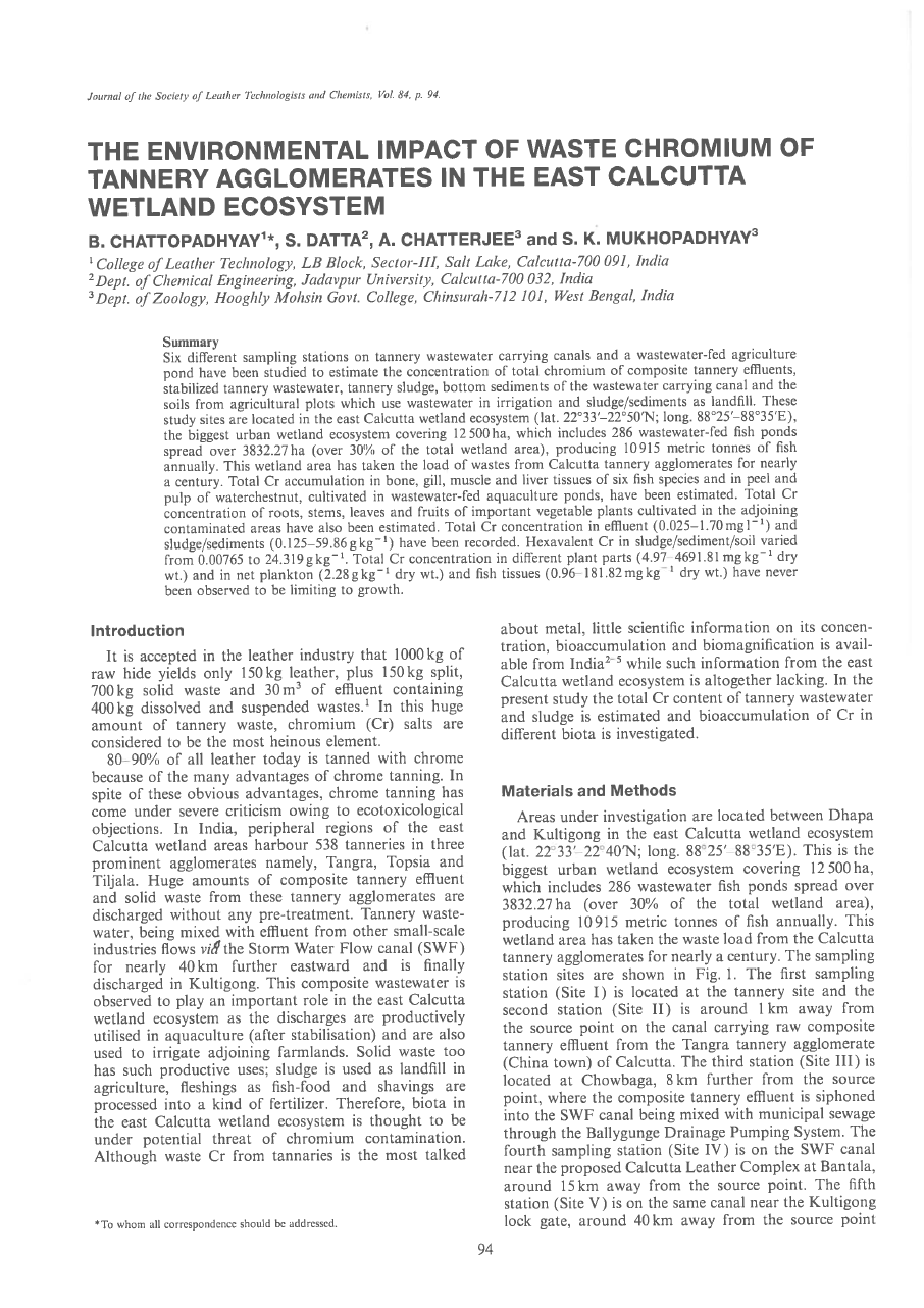 Six different sampling stations on tannery wastewater carrying canals and a wastewater-fed agriculture pond have been studied to estimate the concentration of total chromium of composite tannery effluents, stabilized tannery wastewater, tannery sludge, bottom sediments of the wastewater carrying canal and the soils from agricultural plots which use wastewater in irrigation and sludge/sediments as landfill. These study sites are located in the east Calcutta wetland ecosystem (lat. 22°33′-22°50′N; long. 88°25′-88°35′E), the biggest urban wetland ecosystem covering 12500 ha, which includes 286 wastewater-fed fish ponds spread over 3832.27 ha (over 30% of the total wetland area), producing 10915 metric tonnes of fish annually. This wetland area has taken the load of wastes from Calcutta tannery agglomerates for nearly a century. Total Cr accumulation in bone, gill, muscle and liver tissues of six fish species and in peel and pulp of waterchestnut, cultivated in wastewater-fed aquaculture ponds, have been estimated. Total Cr concentration of roots, stems, leaves and fruits of important vegetable plants cultivated in the adjoining contaminated areas have also been estimated. Total Cr concentration in effluent (0.025-1.70 mg1-1) and sludge/sediments (0.125-59.86gkg¯¹) have been recorded. Hexavalent Cr in sludge/sediment/soil varied from 0.00765 to 24.319 gkg-1. Total Cr concentration in different plant parts (4.97-4691.81 mg kg-¹ dry wt.) and in net plankton (2.28gkg-¹ dry wt.) and fish tissues (0.96-181.82 mg kg¹ dry wt.) have never been observed to be limiting to growth.