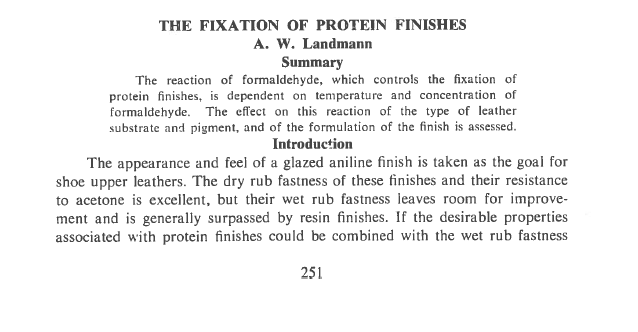 The reaction of formaldehyde, which controls the fixation of protein finishes, is dependent on temperature and concentration of formaldehyde. The effect on this reaction of the type of leather substrate and pigment, and of the formulation of the finish is assessed
