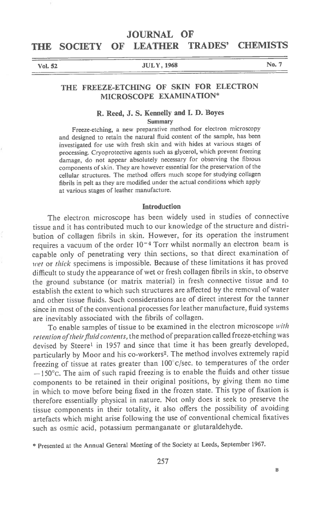 Freeze-etching, a new preparative method for electron microscopy and designed to retain the natural fluid content of the sample, has been investigated for use with fresh skin and with hides at various stages of processing. Cryoprotective agents such as glycerol, which prevent freezing damage, do not appear absolutely necessary for observing the fibrous components of skin. They are however essential for the preservation of the cellular structures. The method offers much scope for studying collagen fibrils in pelt as they are modified under the actual conditions which apply at various stages of leather manufacture