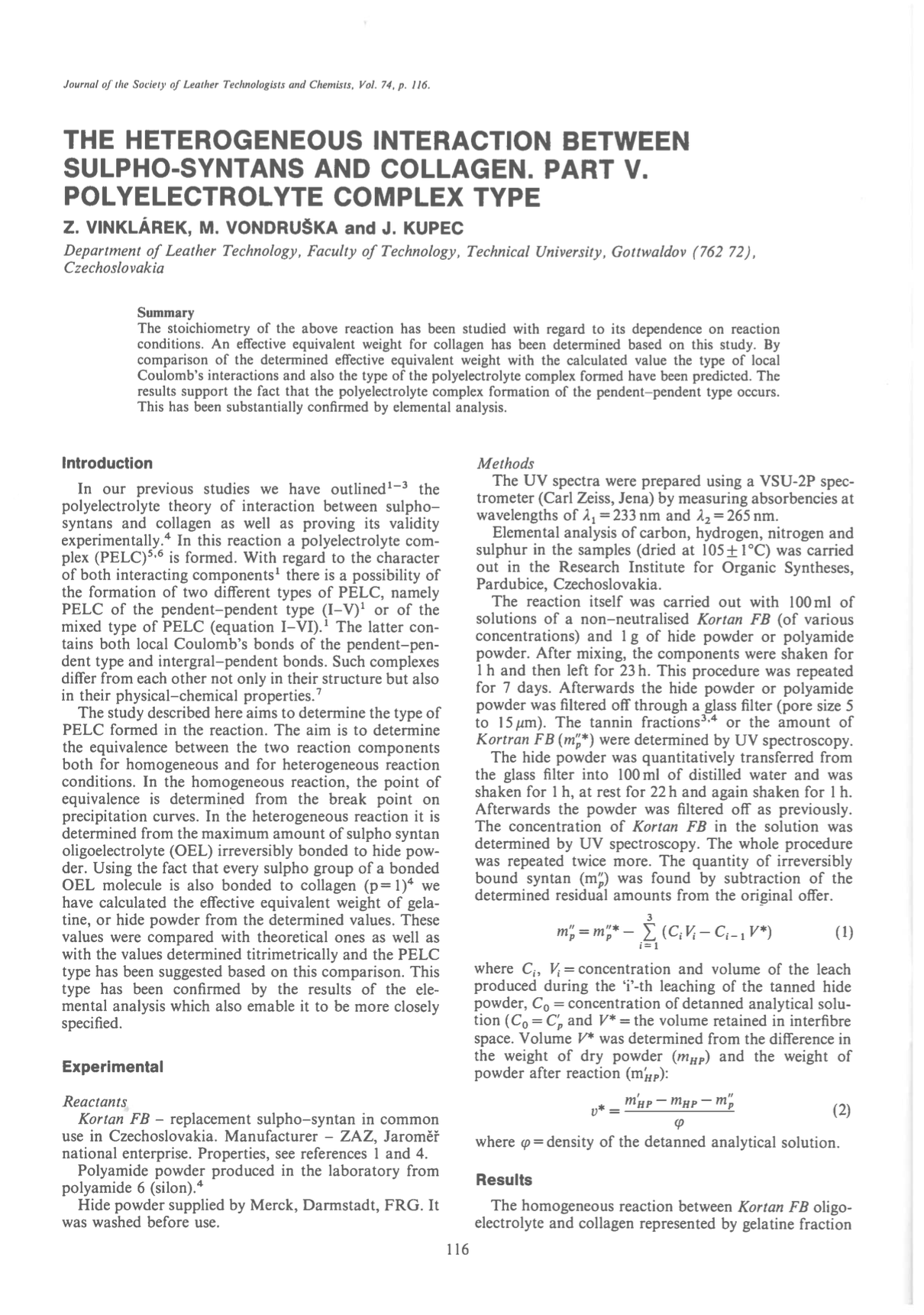The stoichiometry of the above reaction has been studied with regard to its dependence on reaction conditions. An effective equivalent weight for collagen has been determined based on this study. By comparison of the determined effective equivalent weight with the calculated value the type of local Coulomb’s interactions and also the type of the polyelectrolyte complex formed have been predicted. The results support the fact that the polyelectrolyte complex formation of the pendent-pendent type occurs. This has been substantially confirmed by elemental analysis.