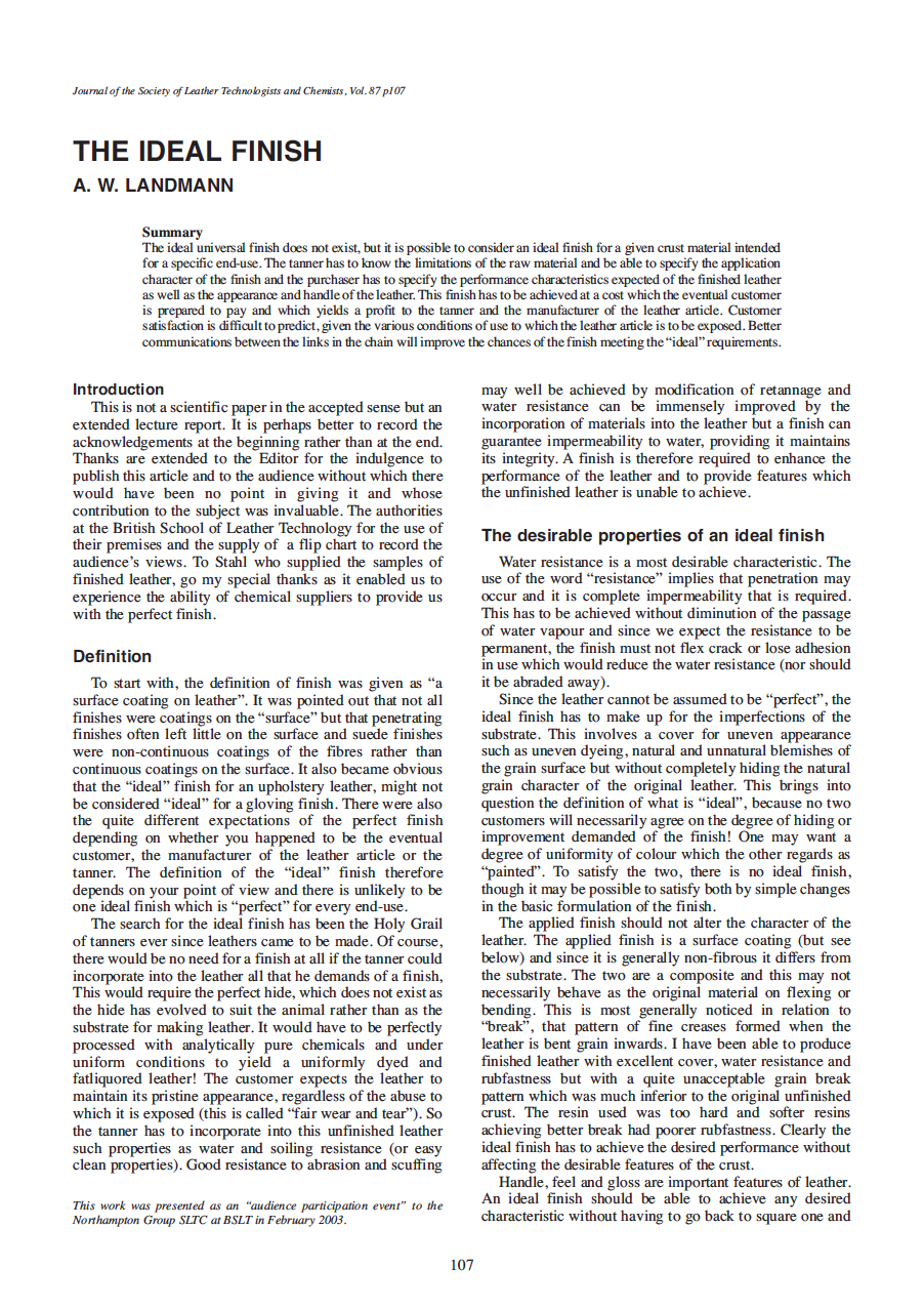 The ideal universal finish does not exist, but it is possible to consider an ideal finish for a given crust material intended for a specific end-use. The tanner has to know the limitations of the raw material and be able to specify the application character of the finish and the purchaser has to specify the performance characteristics expected of the finished leather as well as the appearance and handle of the leather. This finish has to be achieved at a cost which the eventual customer is prepared to pay and which yields a profit to the tanner and the manufacturer of the leather article. Customer satisfaction is difficult to predict, given the various conditions of use to which the leather article is to be exposed. Better communications between the links in the chain will improve the chances of the finish meeting the “ideal” requirements.