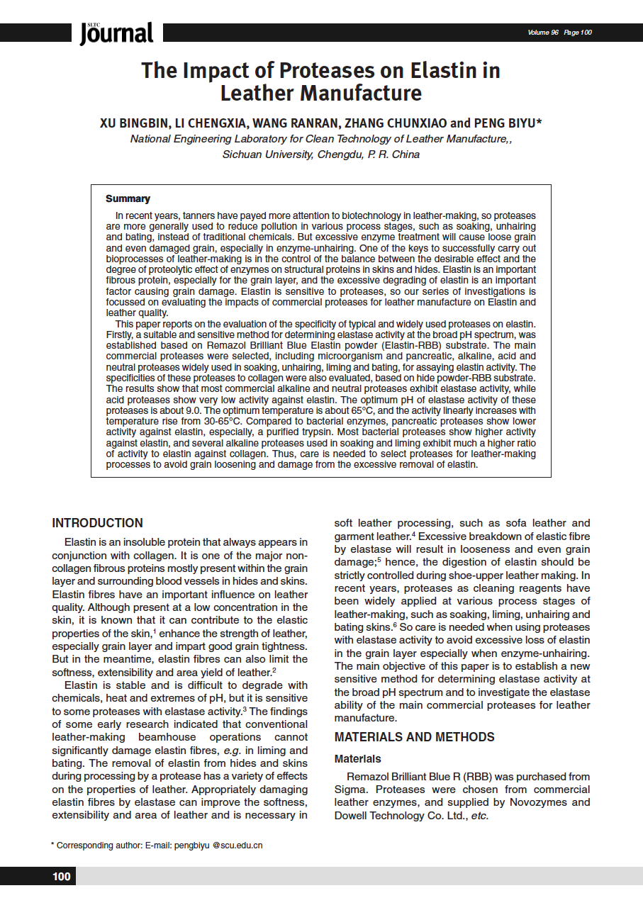 In recent years, tanners have payed more attention to biotechnology in leather-making, so proteases are more generally used to reduce pollution in various process stages, such as soaking, unhairing and bating, instead of traditional chemicals. But excessive enzyme treatment will cause loose grain and even damaged grain, especially in enzyme-unhairing. One of the keys to successfully carry out bioprocesses of leather-making is in the control of the balance between the desirable effect and the degree of proteolytic effect of enzymes on structural proteins in skins and hides. Elastin is an important fibrous protein, especially for the grain layer, and the excessive degrading of elastin is an important factor causing grain damage. Elastin is sensitive to proteases, so our series of investigations is focussed on evaluating the impacts of commercial proteases for leather manufacture on Elastin and leather quality.