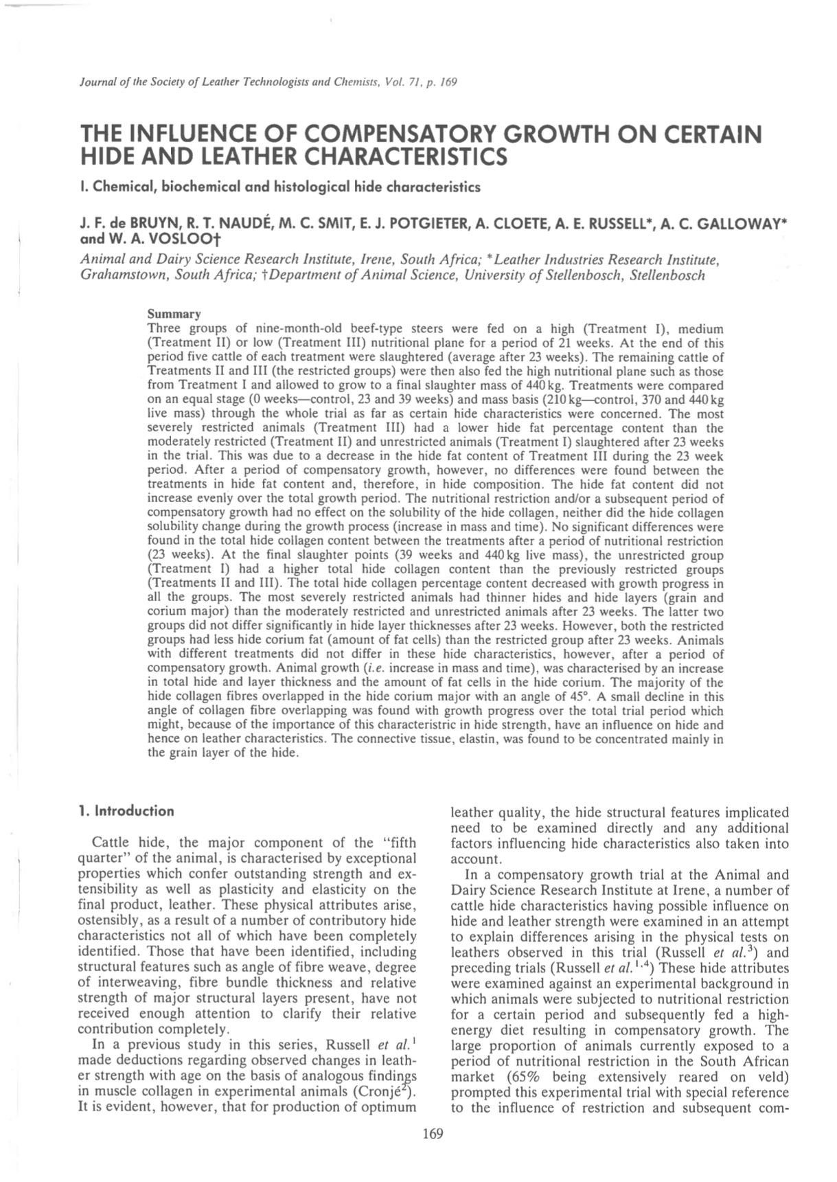 Three groups of nine-month-old beef-type steers were fed on a high (Treatment I), medium (Treatment II), or low (Treatment III) nutritional plane for a period of 21 weeks. At the end of this period five cattle of each treatment were slaughtered (average after 23 weeks). The remaining cattle of Treatments II and III (the restricted groups) were then also fed the high nutritional plane such as those from Treatment I and allowed to grow to a final slaughter mass of 440 kg. Treatments were compared on an equal stage (0 weeks-control, 23 and 39 weeks) and mass basis (210 kg-control, 370 and 440 kg live mass) through the whole trial as far as certain hide characteristics were concerned. The most severely restricted animals (Treatment lII) had a lower hide fat percentage content than the moderately restricted (Treatment II) and unrestricted animals (Treatment I) slaughtered after 23 weeks in the trial. This was due to a decrease in the hide fat content of Treatment III during the 23 week period. After a period of compensatory growth, however, no differences were found between the treatments in hide fat content and, therefore, in hide composition. The hide fat content did not increase evenly over the total growth period. The nutritional restriction and/or a subsequent period of compensatory growth had no effect on the solubility of the hide collagen, neither did the hide collagen solubility change during the growth process (increase in mass and time). No significant differences were found in the total hide collagen content between the treatments after a period of nutritional restriction (23 weeks). At the final slaughter points (39 weeks and 440 kg live mass), the unrestricted group (Treatment I) had a higher total hide collagen content than the previously restricted groups (Treatments II and III). The total hide collagen percentage content decreased with growth progress in all the groups. The most severely restricted animals had thinner hides and hide layers (grain and corium major) than the moderately restricted and unrestricted animals after 23 weeks. The latter two groups did not differ significantly in hide layer thicknesses after 23 weeks. However, both the restricted groups had less hide corium fat (amount of fat cells) than the restricted group after 23 weeks. Animals with different treatments did not differ in these hide characteristics, however, after a period of compensatory growth. Animal growth (i.e. increase in mass and time), was characterised by an increase in total hide and layer thickness and the amount of fat cells in the hide corium. The majority of the hide collagen fibres overlapped in the hide corium major with an angle of 45°. A small decline in this angle of collagen fibre overlapping was found with growth progress over the total trial period which might, because of the importance of this characteristic in hide strength, have an influence on hide and hence on leather characteristics. The connective tissue, elastin, was found to be concentrated mainly in the grain layer of the hide.