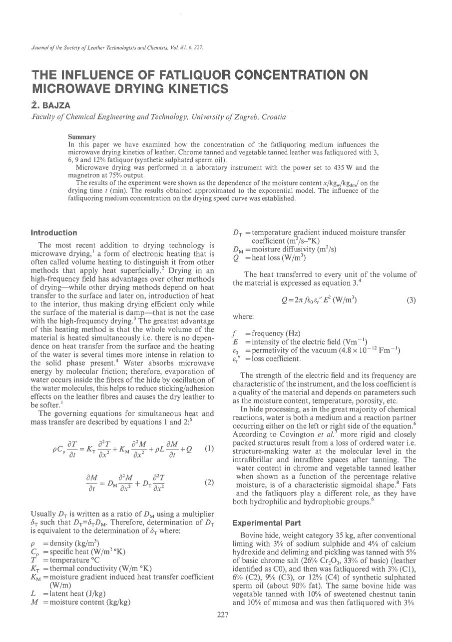 The Influence Of Fatliquor Concentration On Microwave Drying Kinetics