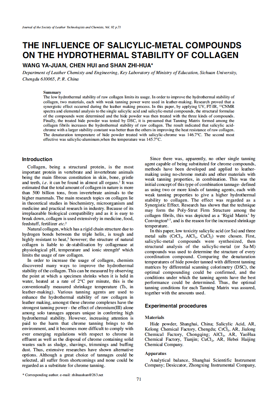 The low hydrothermal stability of raw collagen limits its usage. In order to improve the hydrothermal stability of collagen, two materials, each with weak tanning power were used in leather-making. Research proved that a synergistic effect occurred during the leather making process. In this paper, by applying UV, FT-IR, 13CNMR spectra and elemental analysis to the single salicylic acid and salicylic-metal compounds, the structural formulae of the compounds were determined and the hide powder was then treated with the three kinds of compounds. Finally, the treated hide powder was tested by DSC, it is presumed that Tanning Matrix formed among the collagen fibrils increases the hydrothermal stability of raw collagen. The result indicated that salicylic acidchrome with a larger stability constant was better than the others in improving the heat resistance of raw collagen. The denaturation temperature of hide powder treated with salicylic-chrome was 146.7°C. The second most effective was salicylic-aluminum,when the temperature was 145.7°C.