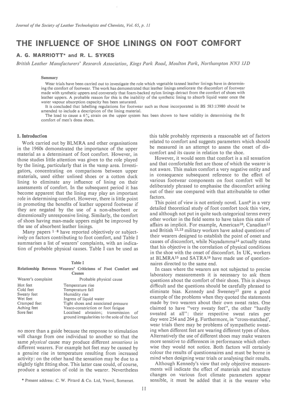 Wear trials have been carried out to investigate the role which vegetable tanned leather linings have in determining the comfort of footwear. The work has demonstrated that leather linings ameliorate the discomfort of footwear made with synthetic uppers and conversely that foam-backed nylon linings detract from the comfort of shoes with leather uppers. A probable reason for this is the inability of the synthetic lining to absorb liquid water once the water vapour absorption capacity has been saturated. It is concluded that labelling regulations for footwear such as those incorporated in BS 583:13980 should be amended to include a description of the lining material. The load to cause a 6% strain on the upper system has been shown to have validity in determining the fit comfort of men’s dress shoes.