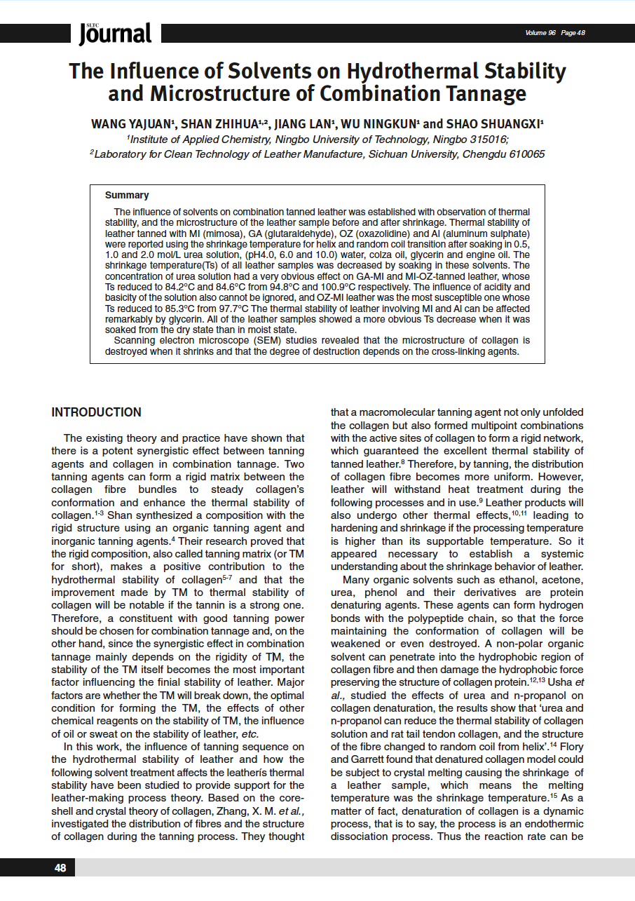 The influence of solvents on combination tanned leather was established with observation of thermal stability, and the microstructure of the leather sample before and after shrinkage. Thermal stability of leather tanned with MI (mimosa), GA (glutaraldehyde), OZ (oxazolidine) and Al (aluminum sulphate) were reported using the shrinkage temperature for helix and random coil transition after soaking in 0.5, 1.0 and 2.0 mol/L urea solution, (pH4.0, 6.0 and 10.0) water, colza oil, glycerin and engine oil. The shrinkage temperature(Ts) of all leather samples was decreased by soaking in these solvents. The concentration of urea solution had a very obvious effect on GA-MI and MI-OZ-tanned leather, whose Ts reduced to 84.2°C and 84.6°C from 94.8°C and 100.9°C respectively. The influence of acidity and basicity of the solution also cannot be ignored, and OZ-MI leather was the most susceptible one whose Ts reduced to 85.3°C from 97.7°C The thermal stability of leather involving MI and Al can be affected remarkably by glycerin. All of the leather samples showed a more obvious Ts decrease when it was soaked from the dry state than in moist state.
