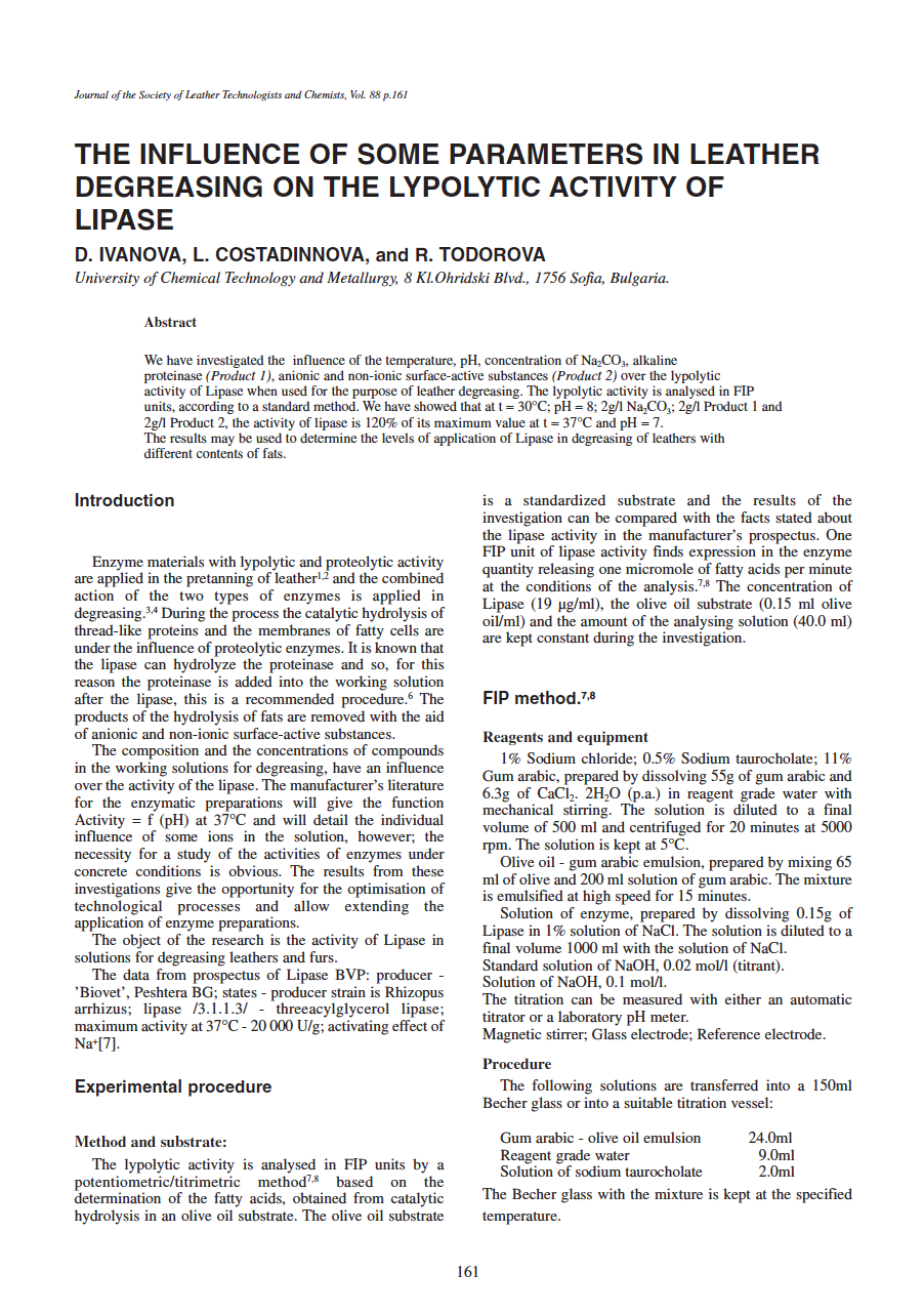 The Influence Of Some Parameters In Leather Degreasing On The Lypolytic Activity Of Lipase