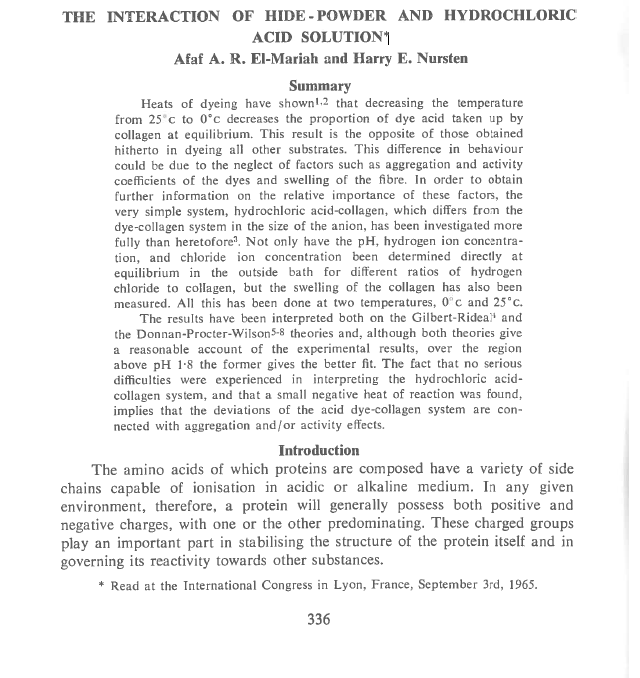 Heats of dyeing have shownl 2that decreasing the temperature from 25°c to 0°c decreases the proportion of dye acid taken up by collagen at equilibrium. This result is the opposite of those obtained hitherto in dyeing all other substrates. This difference in behaviour could be due to the neglect of factors such as aggregation and activity coefficients of the dyes and swelling of the fibre. In order to obtain further information on the relative importance of these factors, the very simple system, hydrochloric acid-collagen, which differs from the dye-collagen system in the size of the anion, has been investigated more fully than heretofor&. Not only have the pH, hydrogen ion concentra tion, and chloride ion concentration been determined directly at equilibrium in the outside bath for different ratios of hydrogen chloride to collagen, but the swelling of the collagen has also been measured. All this has been done at two temperatures. 0°c and 25°c. The results have been interpreted both on the Gilbert-RideaP and the Donnan-Procter-Wilson 5-8theories and, although both theories give a reasonable account of the experimental results, over the region above pH l8 the former gives the better fit. The fact that no serious difficulties were experienced in interpreting the hydrochloric acidcollagen system, and that a small negative heat of reaction was found, implies that the deviations of the acid dye-collagen system are con nected with aggregation and/or activity effects.