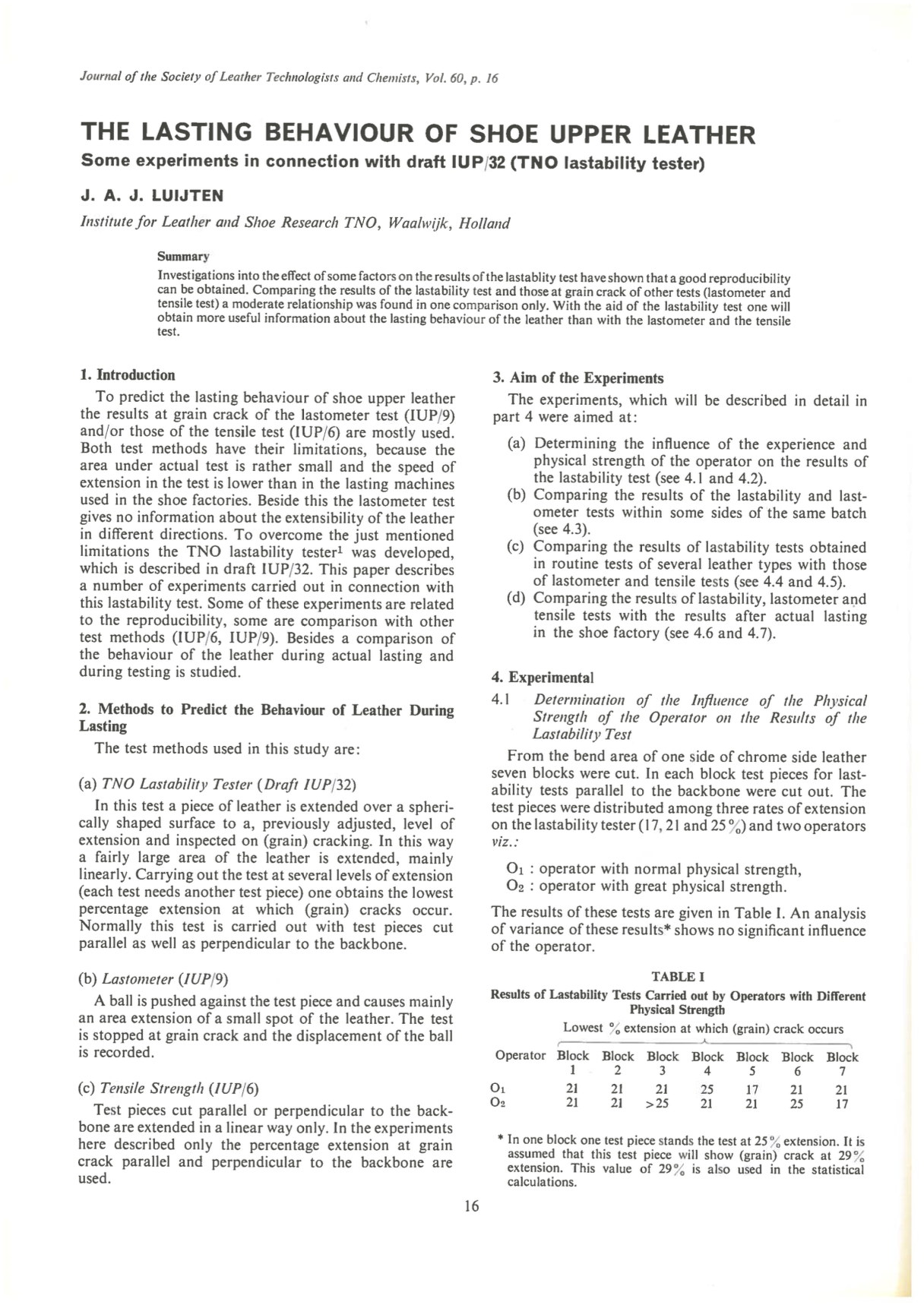 Investigations into the effect of some factors on the results of the lastability test have shown that a good reproducibility can be obtained. Comparing the results of the lastability test and those at grain crack of other tests (lastometer and tensile test) a moderate relationship was found in one comparison only. With the aid of the lastability test one will obtain more useful information about the lasting behaviour of the leather than with the lastometer and the tensile test.