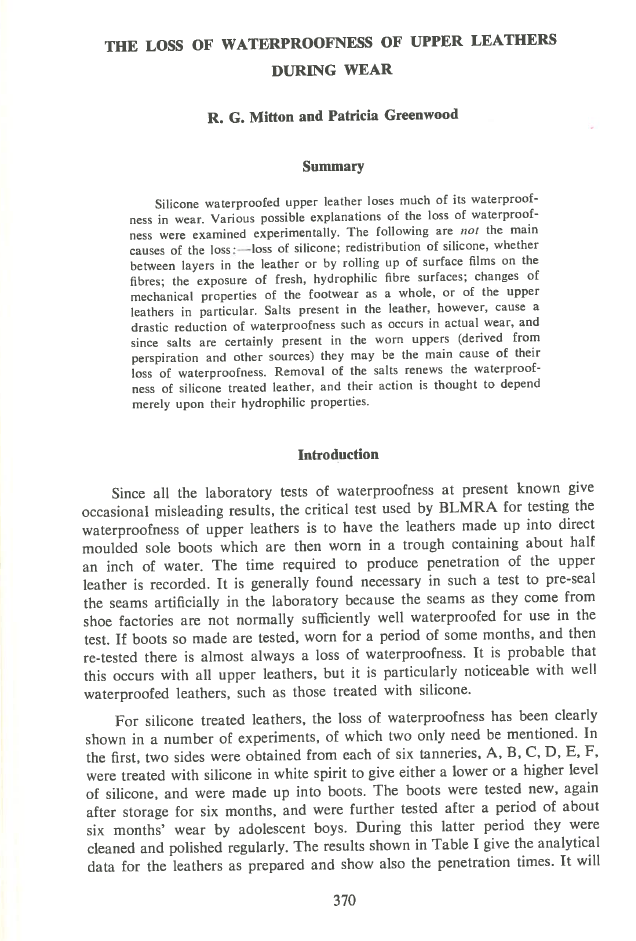 Silicone waterproofed upper leather loses much of its waterproofness in wear. Various possible explanations of the loss of were examined experimentally. The following are not the main causes of the loss : —loss of silicone; redistribution of silicone, whether between layers in the leather or by rolling up of surface films on the fibres; the exposure of fresh, hydrophilic fibre surfaces; changes of mechanical properties of the footwear as a whole, or of the upper leathers in particular. Salts present in the leather, however, cause a drastic reduction of waterproofness such as occurs in actual wear, and since salts are certainly present in the worn uppers (derived from perspiration and other sources) they may be the main cause of their loss of waterproofness. Removal of the salts renews the waterproofness of silicone treated leather, and their action is thought to depend merely upon their hydrophilic properties.
