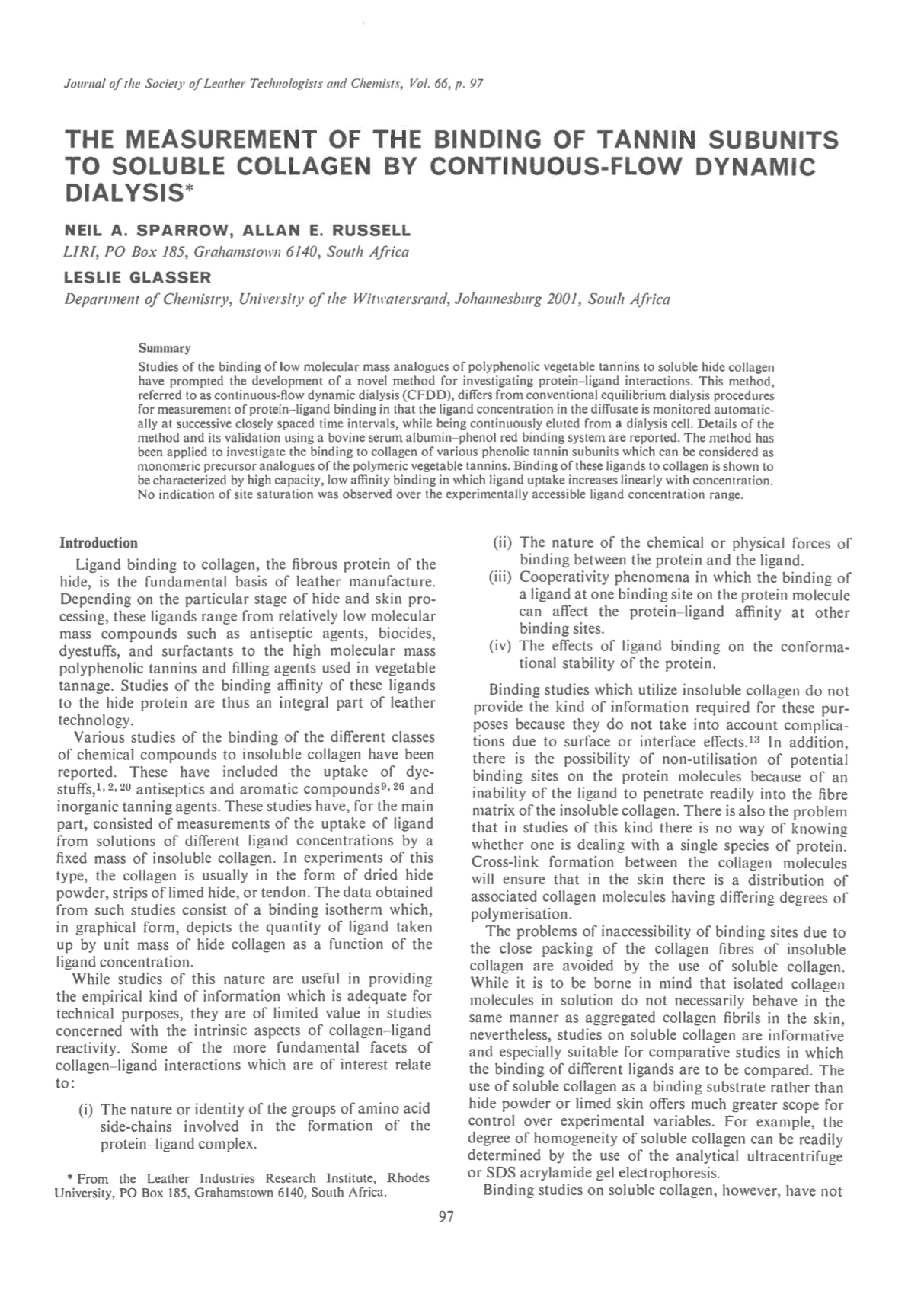 Studies of the binding of low molecular mass analogues of polyphenolic vegetable tannins to soluble hide collagen have prompted the development of a novel method for investigating protein-ligand interactions. This method, referred to as continuous-flow dynamic dialysis (CFDD), differs from conventional equilibrium dialysis procedures for measurement of protein-ligand binding in that the ligand concentration in the diffusate is monitored automatically at successive closely spaced time intervals, while being continuously eluted from a dialysis cell. Details of the method and its validation using a bovine serum albumin-phenol red binding system are reported. The method has been applied to investigate the binding to collagen of various phenolic tannin subunits which can be considered as monomeric precursor analogues of the polymeric vegetable tannins. Binding of these ligands to collagen is shown to be characterized by high capacity, low affinity binding in which ligand uptake increases linearly with concentration. No indication of site saturation was observed over the experimentally accessible ligand concentration range.