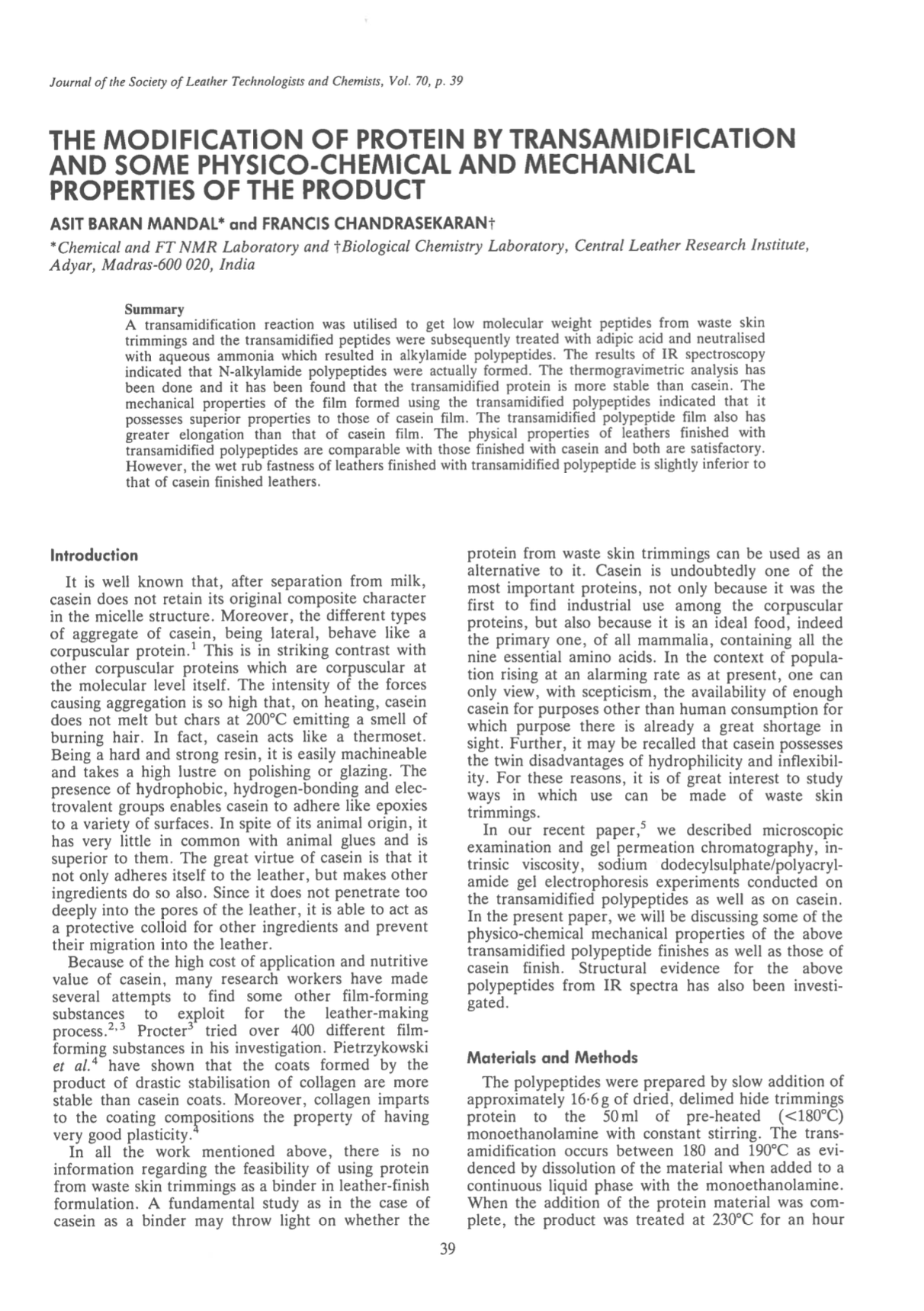 A transamidification reaction was utilised to get low molecular weight peptides from waste skin trimmings and the transamidified peptides were subsequently treated with adipic acid and neutralised with aqueous ammonia which resulted in alkylamide polypeptides. The results of JR spectroscopy indicated that N-alkylamide polypeptides were actually formed. The thermogravimetric analysis has been done and it has been found that the transamidified protein is more stable than casein. The mechanical properties of the film formed using the transamidified polypeptides indicated that it possesses superior properties to those of casein film. The transamidified polypeptide film also has greater elongation than that of casein film. The physical properties of leathers finished with transamidified polypeptides are comparable with those finished with casein and both are satisfactory. However, the wet rub fastness of leathers finished with transamidified polypeptide is slightly inferior to that of casein finished leathers.