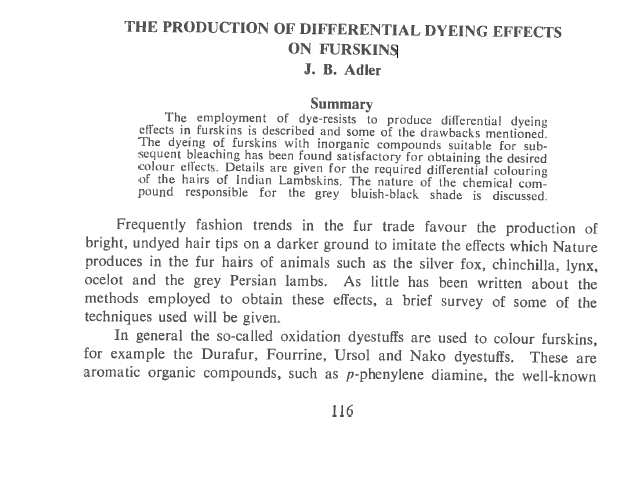 The employment of dye-resists to produce differential dyeing effects in furskins is described and some of the drawbacks mentioned. The dyeing of furskins with inorganic compounds suitable for sub sequent bleaching has been found satisfactory for obtaining the desired colour effects. Details are given for the required dillerential colouring of the hairs of Indian Lambskins. The nature of the chemical com pound responsible for the grey bluish-black shade is discussed.