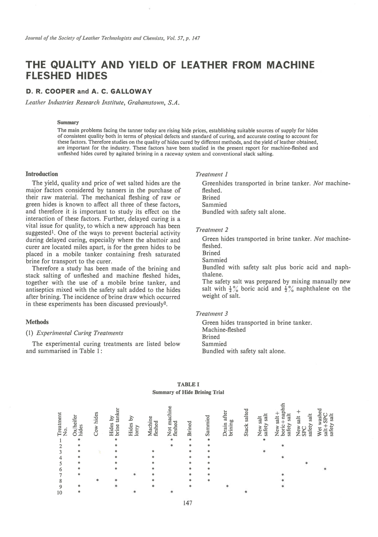 The main problems facing the tanner today are rising hide prices, establishing suitable sources of supply for hides of consistent quality both in terms of physical defects and standard of curing, and accurate costing to account for these factors. Therefore studies on the quality of hides cured by different methods, and the yield of leather obtained, are important for the industry. These factors have been studied in the present report for machine-fleshed and unfleshed hides cured by agitated brining in a raceway system and conventional stack salting.