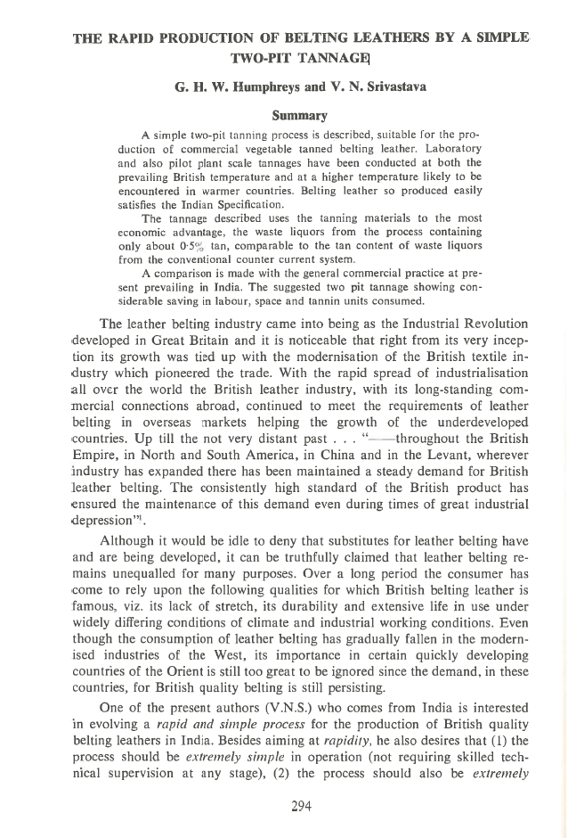 A simple two-pit tanning process is described, suitable for the pro duction of commercial vegetable tanned belting leather. Laboratory and also pilot plant scale tannages have been conducted at both the prevailing British temperature and at a higher temperature likely to be encountered in warmer countries. Belting leather so produced easily satisfies the Indian Specification. The tannage described uses the tanning materials to the most economic advantage, the waste liquors from the process containing only about 05% tan, comparable to the tan content of waste liquors from the conventional counter current system. A comparison is made with the general commercial practice at pre sent prevailing in India. The suggested two pit tannage showing con siderable saving in labour, space and tannin units consumed.