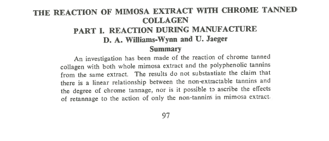 An investigation has been made of the reaction of chrome tanned collagen with both whole mimosa extract and the polyphenolic tannins from the same extract. The results do not substantiate the claim that there is a linear relationship between the non-extractable tannins and the degree of chrome tannage, nor is it possible to ascribe the effects of retannage to the action of only the non-tannins in mimosa extract. 97 It is concluded that both the tannins and the non-tannins react with the chrome-collagen compound displacing sulphate and also causing some dechroming of the chrome tanned pelt.