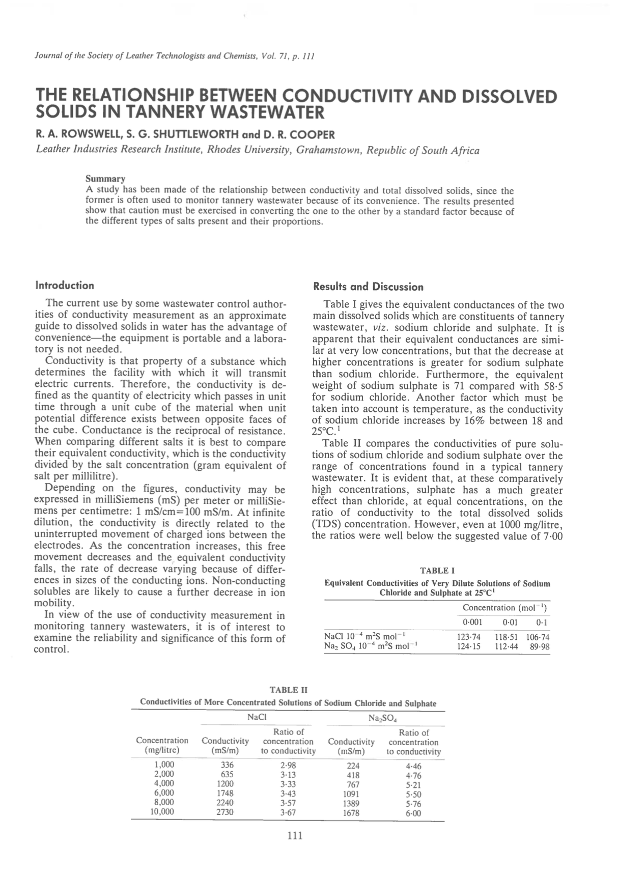 A study has been made of the relationship between conductivity and total dissolved solids, since the former is often used to monitor tannery wastewater because of its convenience. The results presented show that caution must be exercised in converting the one to the other by a standard factor because of the different types of salts present and their proportions.
