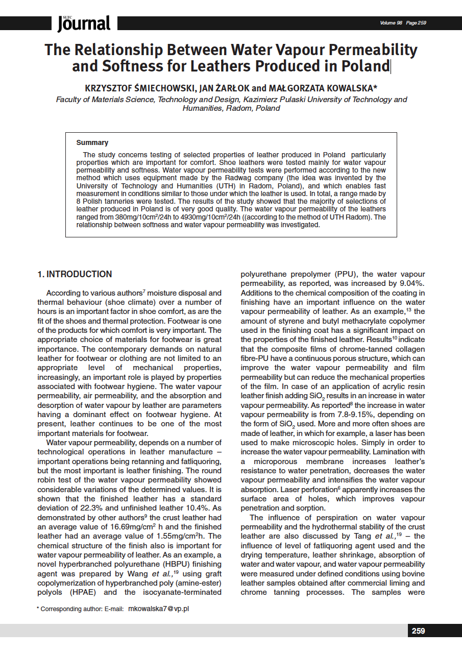 The study concerns testing of selected properties of leather produced in Poland particularly properties which are important for comfort. Shoe leathers were tested mainly for water vapour permeability and softness. Water vapour permeability tests were performed according to the new method which uses equipment made by the Radwag company (the idea was invented by the University of Technology and Humanities (UTH) in Radom, Poland), and which enables fast measurement in conditions similar to those under which the leather is used. In total, a range made by 8 Polish tanneries were tested. The results of the study showed that the majority of selections of leather produced in Poland is of very good quality. The water vapour permeability of the leathers ranged from 380mg/10cm2/24h to 4930mg/10cm2/24h ((according to the method of UTH Radom). The relationship between softness and water vapour permeability was investigated.