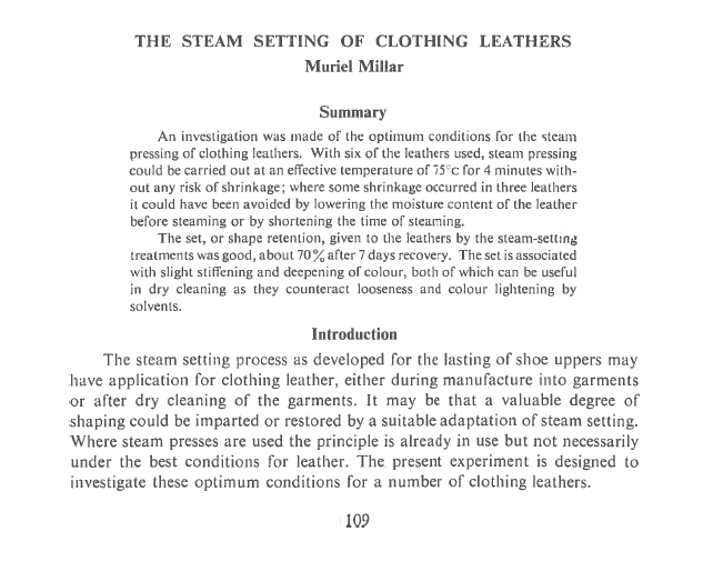 An investigation was made of the optimum conditions for the steam pressing of clothing leathers. With six of the leathers used, steam pressing could be carried out at an effective temperature of 75°c for 4 minutes with out any risk of shrinkage; where some shrinkage occurred in three leathers it could have been avoided by lowering the moisture content of the leather before steaming or by shortening the time of steaming.