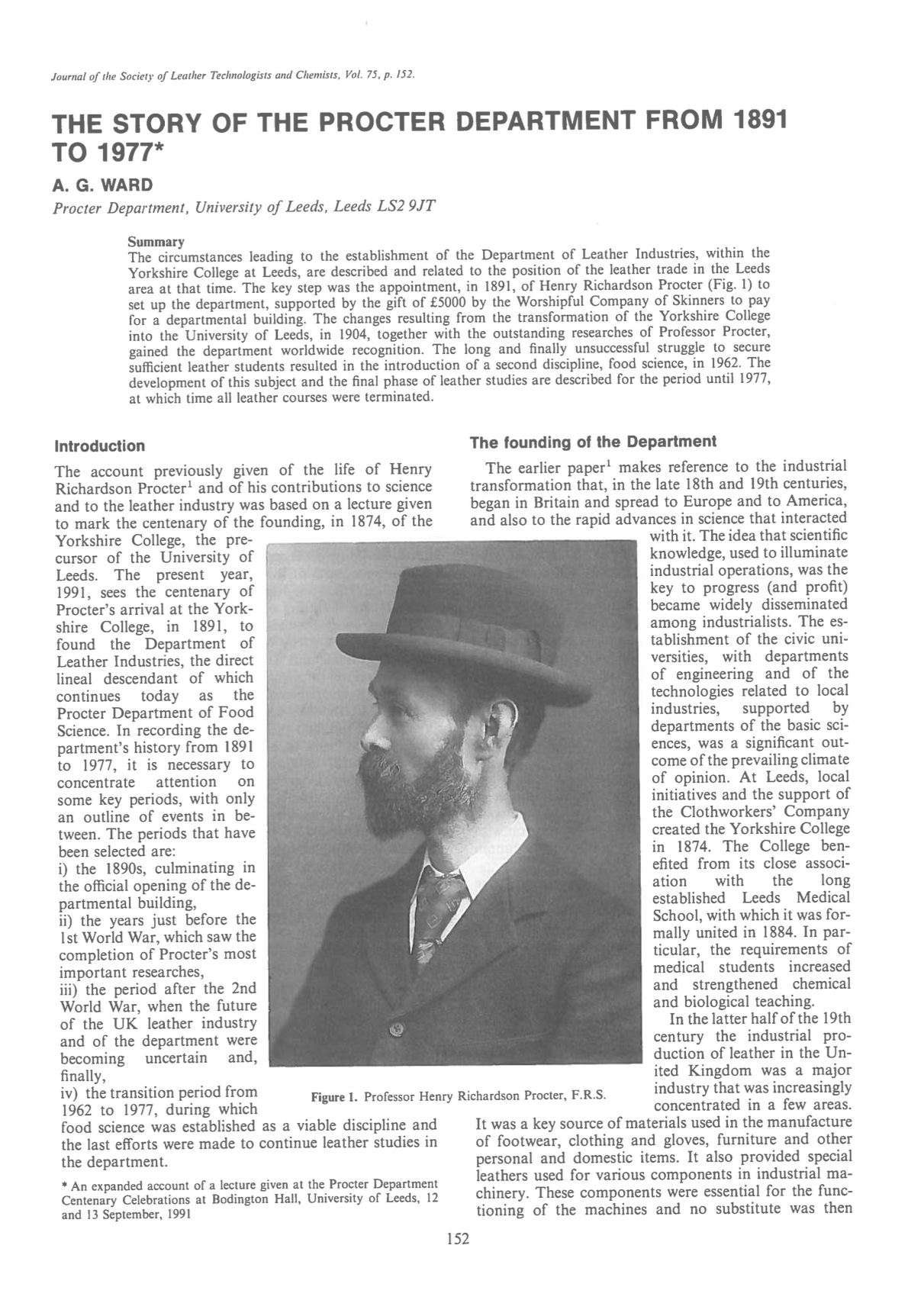 The circumstances leading to the establishment of the Department of Leather Industries, within the Yorkshire College at Leeds, are described and related to the position of the leather trade in the Leeds area at that time. The key step was the appointment, in 1891, of Henry Richardson Procter (Fig. 1) to set up the department, supported by the gift of £5000 by the Worshipful Company of Skinners to pay for a departmental building. The changes resulting from the transformation of the Yorkshire College into the University of Leeds, in 1904, together with the outstanding researches of Professor Procter, gained the department worldwide recognition. The long and finally unsuccessful struggle to secure sufficient leather students resulted in the introduction of a second discipline, food science, in 1962. The development of this subject and the final phase of leather studies are described for the period until 1977, at which time all leather courses were terminated.