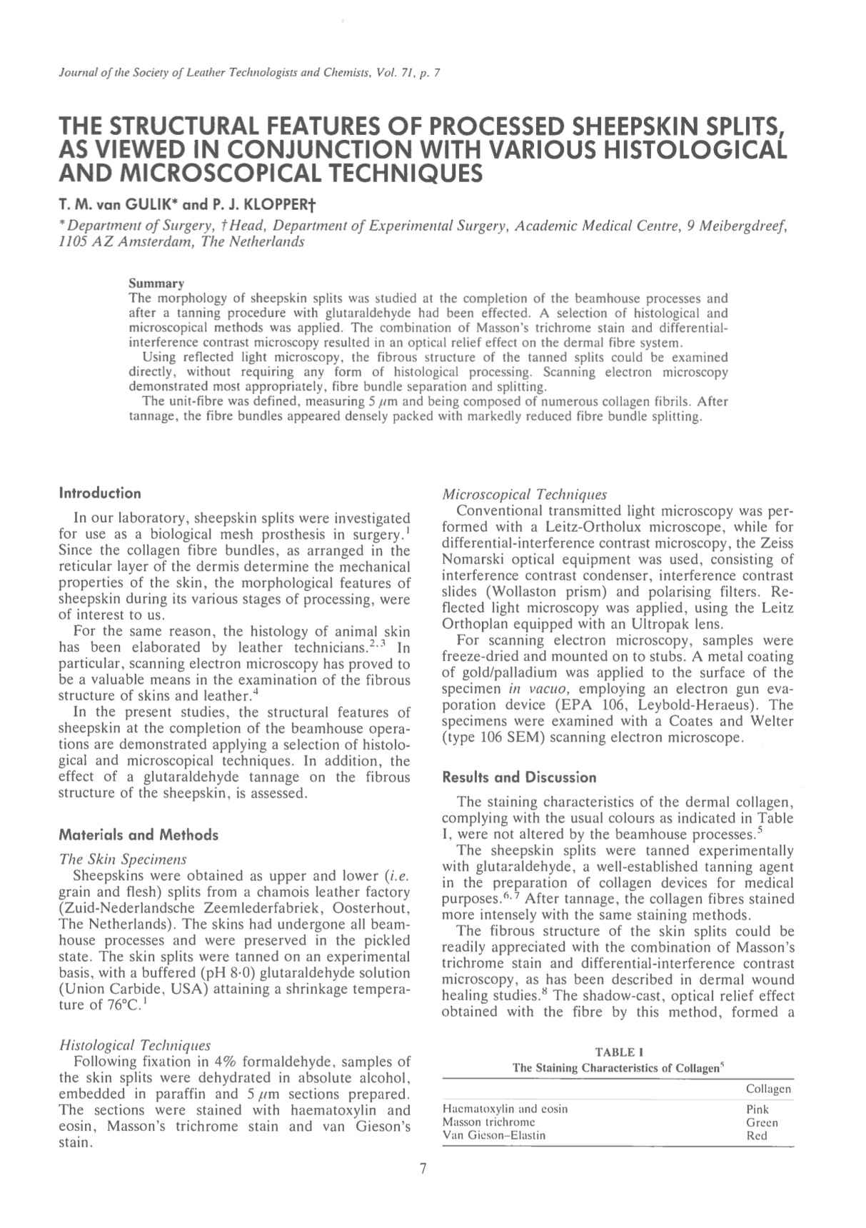 The morphology of sheepskin splits was studied at the completion of the beamhouse processes and after a tanning procedure with glutaraldehyde had been effected. A selection of histological and microscopical methods was applied. The combination of Masson’s trichrome stain and differential-interference contrast microscopy resulted in an optical relief effect on the dermal fibre system. Using reflected light microscopy, the fibrous structure of the tanned splits could be examined directly, without requiring any form of histological processing. Scanning electron microscopy demonstrated most appropriately, fibre bundle separation and splitting. The unit-fibre was defined, measuring 5 tm and being composed of numerous collagen fibrils. After tannage, the fibre bundles appeared densely packed with markedly reduced fibre bundle splitting.