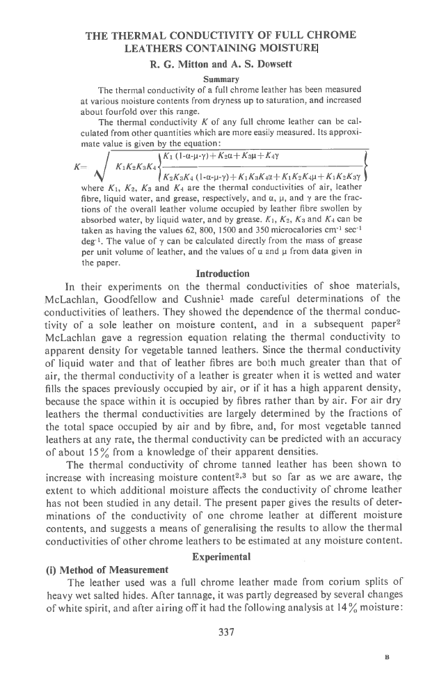 The thermal conductivity of a full chrome leather has been measured at various moisture contents from dryness up to saturation, and increased about fourfold over this range. The thermal conductivity K of any full chrome leather can be cal culated from other quantities which are more easily measured. Its approxi mate value is given by the equation: