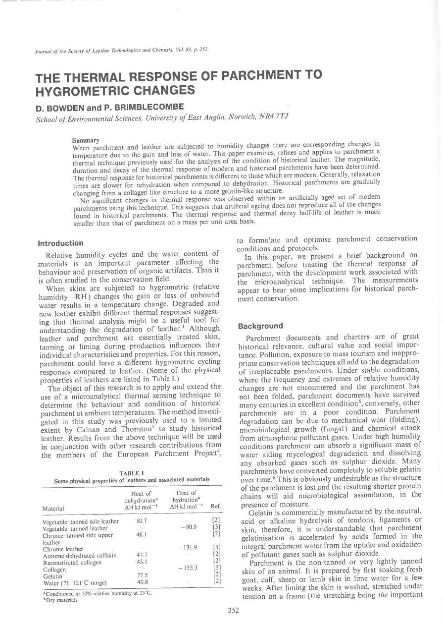 When parchment and leather are subjected to humidity changes there are corresponding changes in temperature due to the gain and loss of water. This paper examines, refines and applies to parchment a thermal technique previously used for the analysis of the condition of historical leather. The magnitude, duration and decay of the thermal response of modern and historical parchments have been determined. The thermal response for historical parchments is different to those which are modern. Generally, relaxation times are slower for rehydration when compared to dehydration. Historical parchments are gradually changing from a collagen like structure to a more gelatin-like structure. No significant changes in thermal response was observed within an artificially aged set of modern parchments using this technique. This suggests that artificial ageing does not reproduce all of the changes found in historical parchments. The thermal response and thermal decay half-life of leather is much smaller than that of parchment on a mass per unit area basis.When parchment and leather are subjected to humidity changes there are corresponding changes in temperature due to the gain and loss of water. This paper examines, refines and applies to parchment a thermal technique previously used for the analysis of the condition of historical leather. The magnitude, duration and decay of the thermal response of modern and historical parchments have been determined. The thermal response for historical parchments is different to those which are modern. Generally, relaxation times are slower for rehydration when compared to dehydration. Historical parchments are gradually changing from a collagen like structure to a more gelatin-like structure.