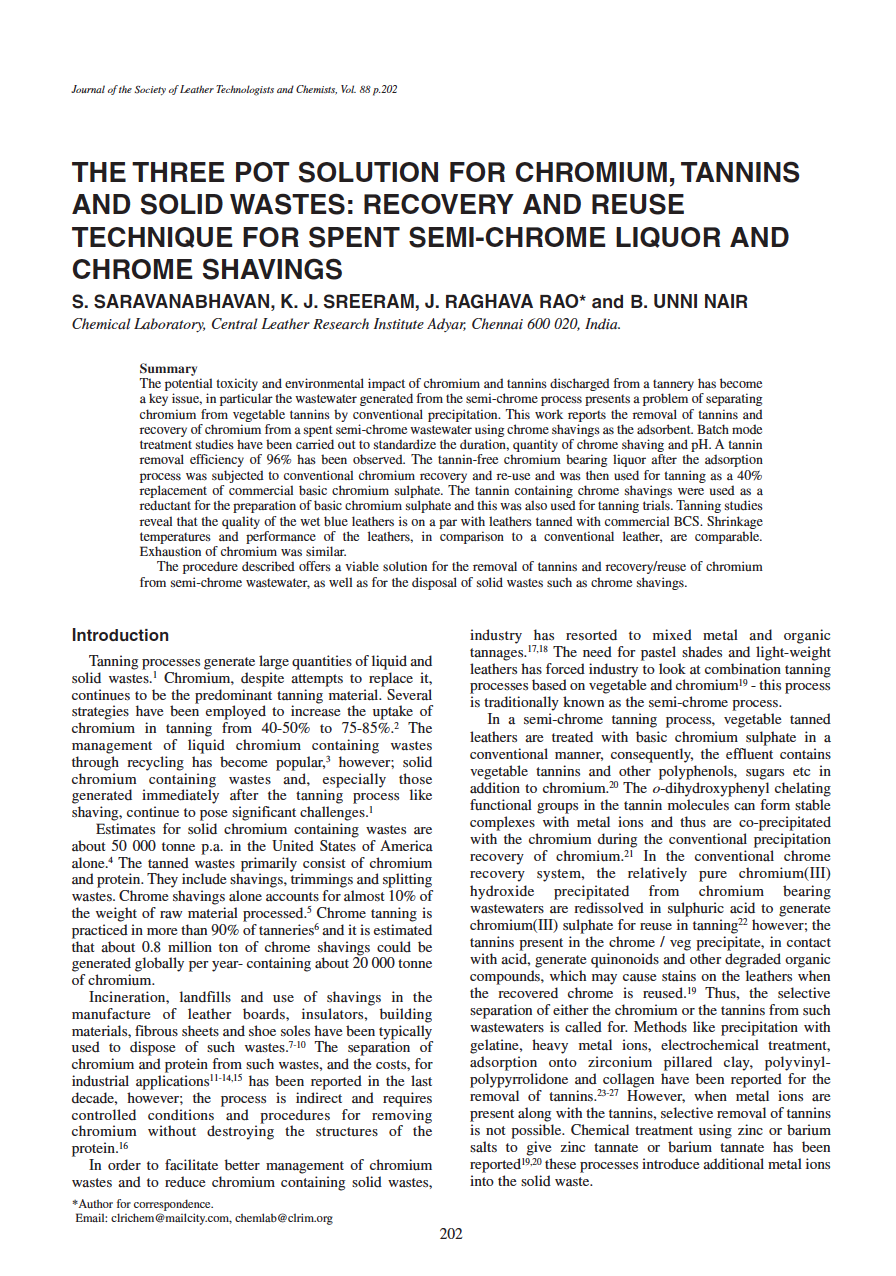 The procedure described offers a viable solution for the removal of tannins and recovery/reuse of chromium from semi-chrome wastewater, as well as for the disposal of solid wastes such as chrome shavings.