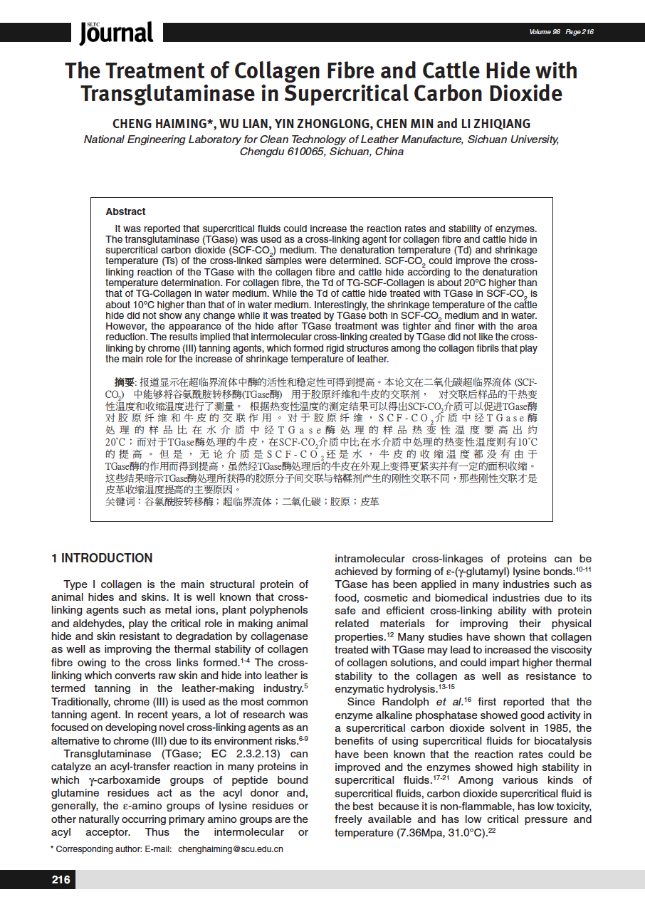 It was reported that supercritical fluids could increase the reaction rates and stability of enzymes. The transglutaminase (TGase) was used as a cross-linking agent for collagen fibre and cattle hide in supercritical carbon dioxide (SCF-CO2) medium. The denaturation temperature (Td) and shrinkage temperature (Ts) of the cross-linked samples were determined. SCF-CO2 could improve the crosslinking reaction of the TGase with the collagen fibre and cattle hide according to the denaturation temperature determination. For collagen fibre, the Td of TG-SCF-Collagen is about 20°C higher than that of TG-Collagen in water medium. While the Td of cattle hide treated with TGase in SCF-CO2 is about 10°C higher than that of in water medium. Interestingly, the shrinkage temperature of the cattle hide did not show any change while it was treated by TGase both in SCF-CO2 medium and in water. However, the appearance of the hide after TGase treatment was tighter and finer with the area reduction. The results implied that intermolecular cross-linking created by TGase did not like the crosslinking by chrome (III) tanning agents, which formed rigid structures among the collagen fibrils that play the main role for the increase of shrinkage temperature of leather.