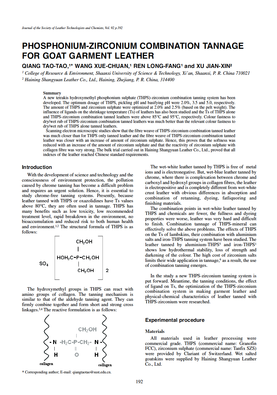 Scanning electron microscopic studies show that the fibre weave of THPS-zirconium combination tanned leather was much closer than for THPS only tanned leather and the fibre weave of THPS-zirconium combination tanned leather was closer with an increase of amount of zirconium sulphate. Hence, this proves that the softness was reduced with an increase of the amount of zirconium sulphate and that the reactivity of zirconium sulphate with collagen fibre was very strong. The bulk trial carried out in Haining Shangyuan Leather Co., Ltd., proved that all indexes of the leather reached Chinese standard requirements.