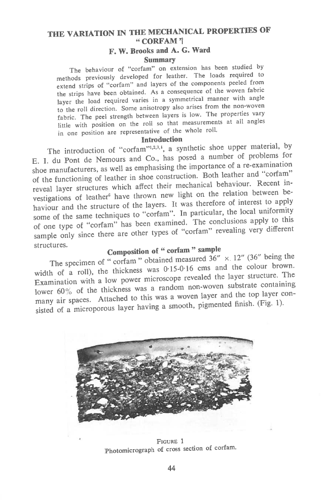 The behaviour of “corfam” on extension has been studied by methods previously developed for leather. The loads required to extend strips of “corfam” and layers of the components peeled from the strips have been obtained. As a consequence of the woven fabric layer the load required varies in a symmetricat manner with angle to the roll direction. Some anisotropy also arises from the non-woven fabric. The peel strength between layers is low. The properties vary little with position on the roll so that measurements at all angles in one position are representative of the whole roll.
