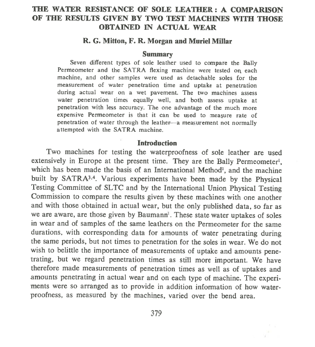 Seven different types of sole leather used to compare the Bally Permeometer and the SATRA flexing machine were tested o each machine, and other samples were used as detachable soles for the measurement of water penetration time and uptake at penetration during actual wear on a wet pavement. The two machines assess water penetration times equally well, and both assess uptake at penetration with less accuracy. The one advantage of the much more expensive Permeometer is that it can be used to measure rate of penetration of water through the leather—a measurement not normally attempted with the SATRA machine.
