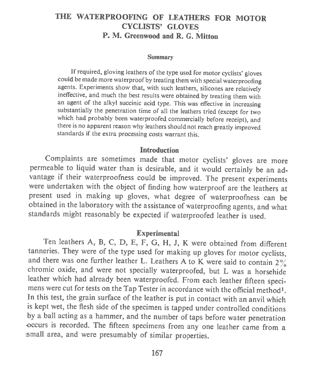 If required, gloving leathers of the type used for motor cyclists’ gloves could be made more waterproof by treating them with special waterproofing agents. Experiments show that, with such leathers, silicones are relatively ineffective, and much the best results were obtained by treating them with an agent of the alkyl succinic acid type. This was effective in increasing substantially the penetration time of all the leathers tried (except for two which had probably been waterproofed commercially before receipt), and there is no apparent reason why leathers should not reach greatly improved standards if the extra processing costs warrant this.